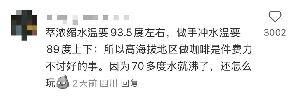 还有网友的角度新奇得让人眼前一亮,他一本正经分析说,萃取浓缩咖啡液水温要93.5度左右,做手冲水温要89度上下,但高海拔地区70多度水就沸腾了,所以高海拔地区做咖啡是件费力不讨好的事。