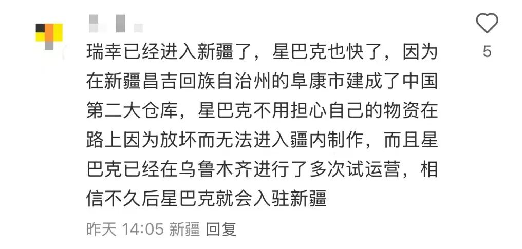 有网友猜测,随着瑞幸等品牌进入新疆、西藏,星巴克应该也快了。