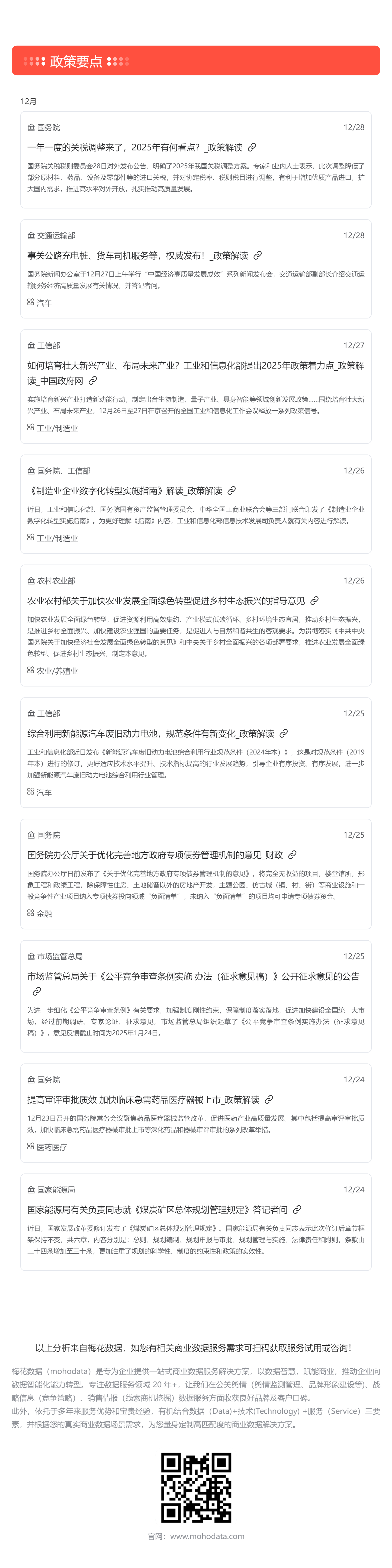 根据梅花数据舆情监测要政盘点统计,监测期间共收录重要政策信息共计39条,其中涉及工业、农业、汽车、运输、医疗等多个领域,建议重点关注《制造业企业数字化转型实施指南》、《关于优化完善地方政府专项债券管理机制的意见》等政策。
