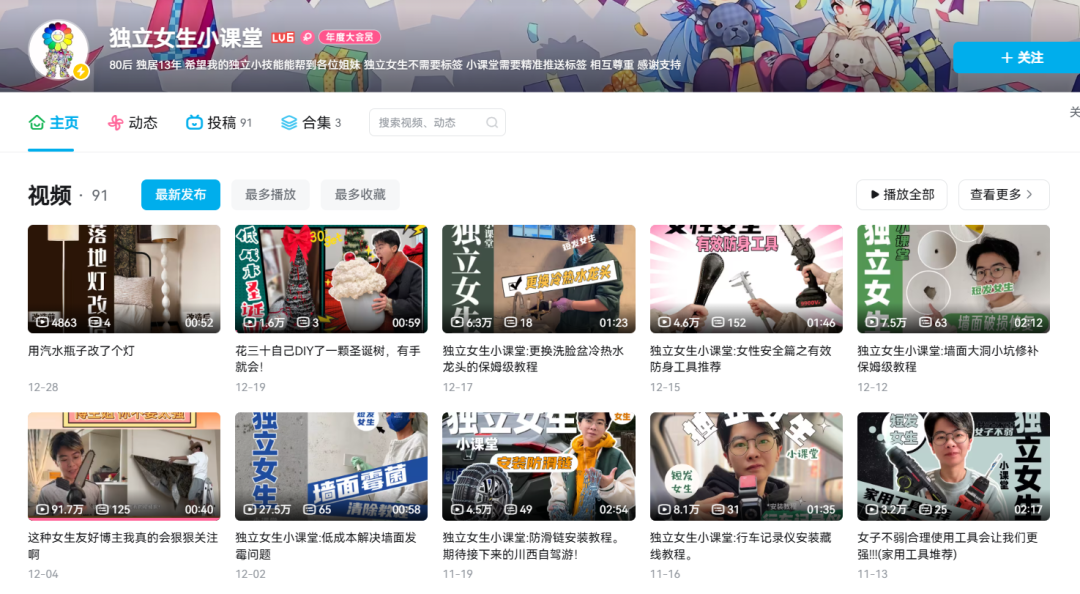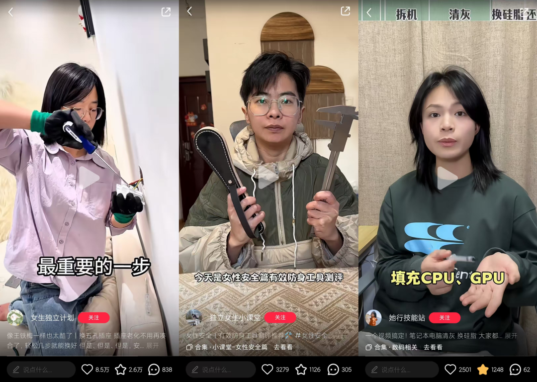 “通过在账号名、视频标题中加入独立女性等标签,可以更容易地吸引到更多女性用户的关注,打破信息茧房,让更多女性有机会学习这些技能,掌控自己的生活。”