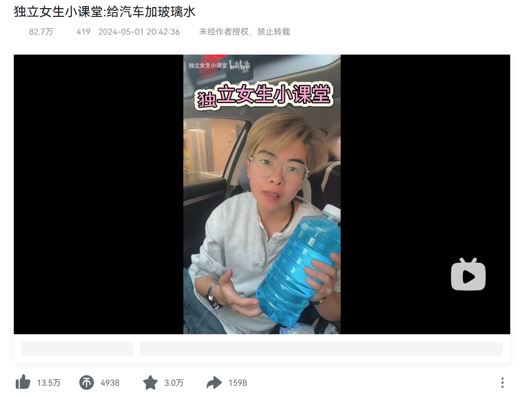 2024 年 5 月, @独立女生小课堂 在 B站 发布了一条“给汽车加玻璃水”的内容,时长不到一分钟,贡献了保姆级教学。