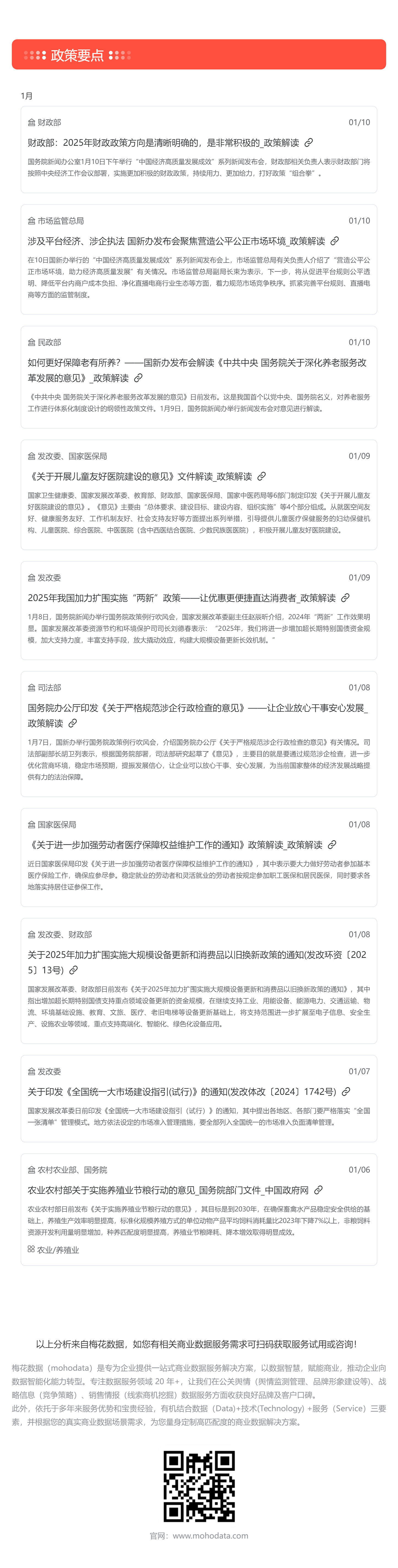 根据梅花数据舆情监测要政盘点统计,监测期间共收录重要政策信息共计92条,其中涉及医疗、养老、市场经济、农牧等多个领域,建议重点关注《全国统一大市场建设指引(试行)》、《关于进一步加强劳动者医疗保障权益维护工作的通知》等政策。