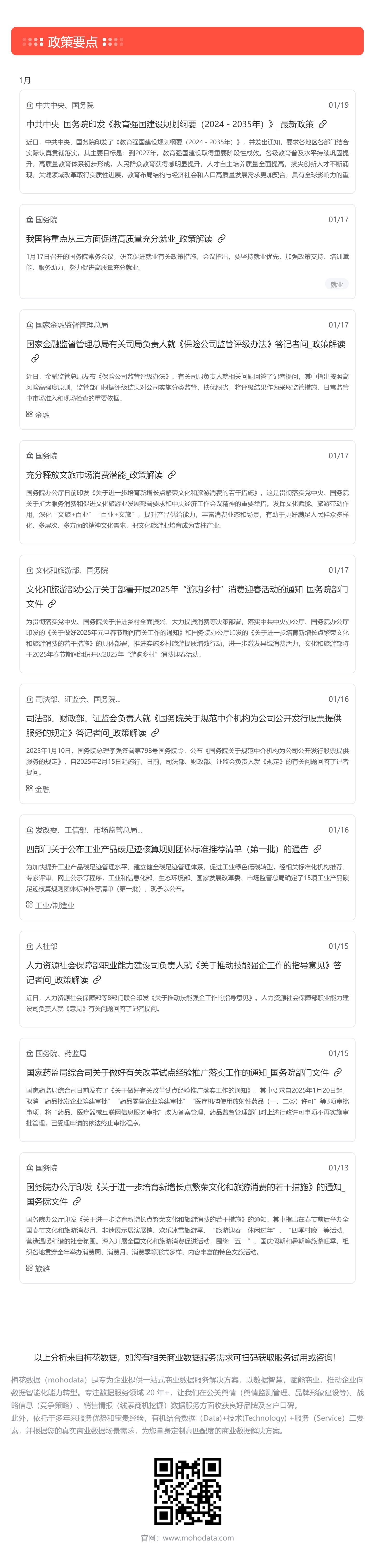 根据梅花数据舆情监测要政盘点统计,监测期间共收录重要政策信息共计95条,其中涉及教育、文旅、保险、环保等多个领域,建议重点关注《教育强国建设规划纲要(2024-2035年)》、《关于进一步培育新增长点繁荣文化和旅游消费的若干措施》等政策。