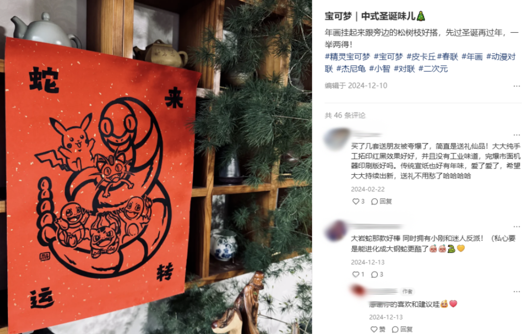 往年的窗花是大胖小子抱金鱼、牡丹花包围红福字,今年《神奇宝贝》的大岩蛇则成了当之无愧的蛇年守护神,与大胖小子一争高下。“唯一的遗憾是没有进化版大钢蛇。”程序员们为了推选Phython小蛇做今年的吉祥物在小红书造势许久,没想到最后被宝可梦玩家截胡。