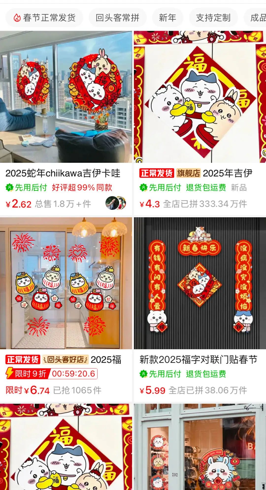 距离新年还有四天,拼多多上的Chiikawa新年窗花销量已经超过了3.5万。“检验你推火不火,先看今年春节有没有他的痛窗和痛联。”