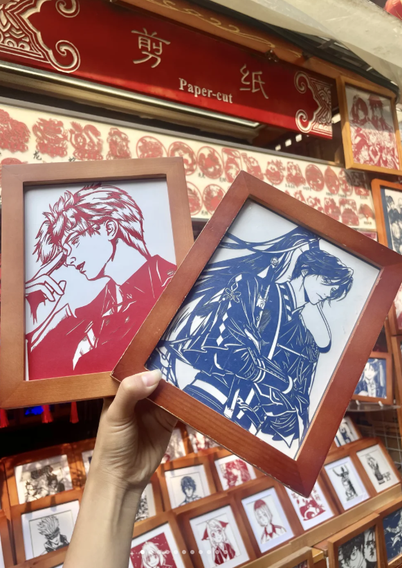 传统年货好几年没做出啥新意,翻来覆去就是老祖宗用烂了的红底黑字,直到JOJO和海贼王爱好者们这条鲶鱼搅浑了水面;以为早早落寞的“剪纸”靠着售卖沈星回、秦彻们的大红头像,摇身成为成都非遗展春节最火爆的摊位。