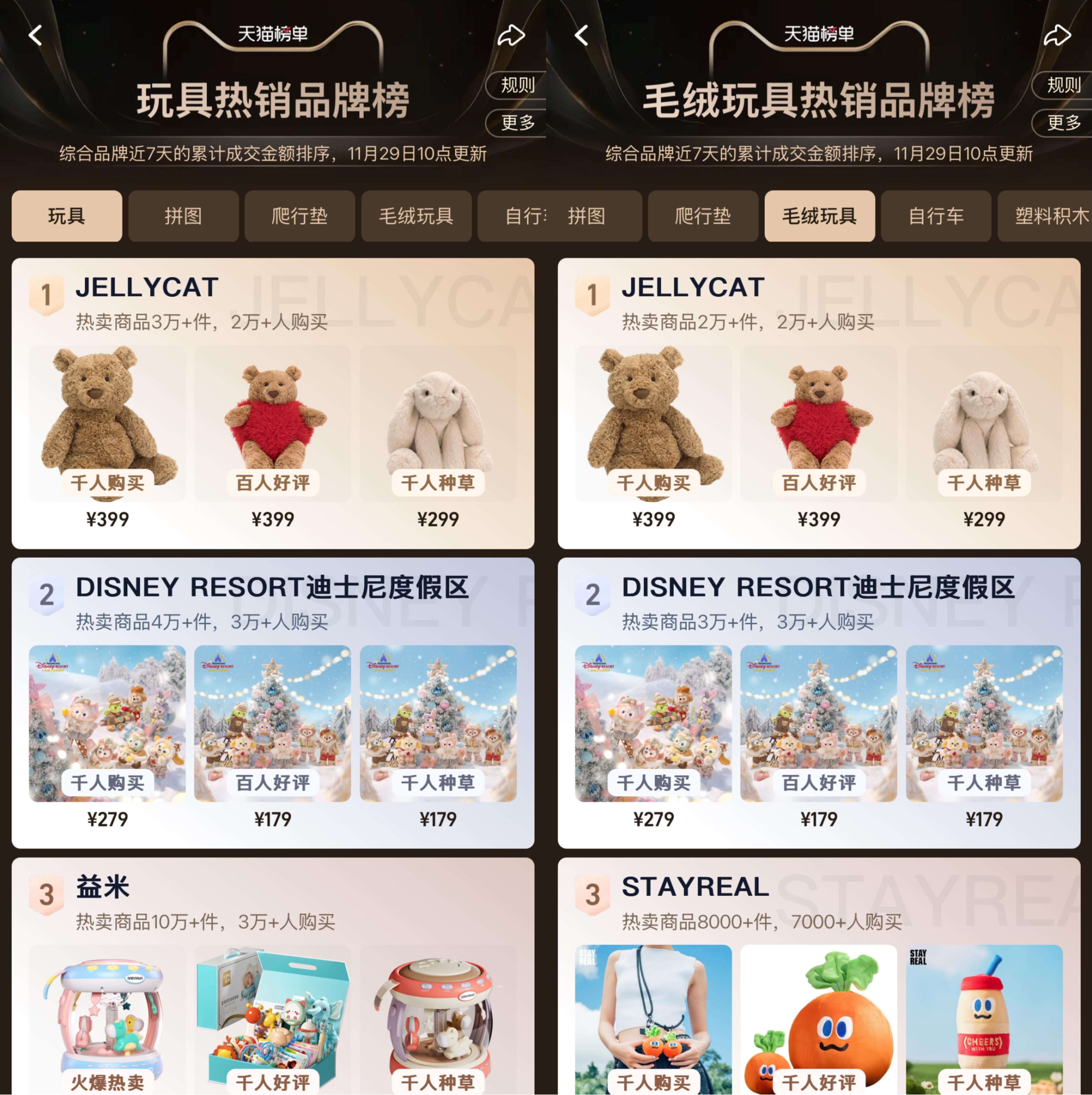 随着冬季到来,毛绒玩具不仅成为了人们热切追逐的时尚与温暖的象征,也如同每年12月各大音乐榜单上火速飞升的圣诞金曲一样,迎来了“解冻”的时机!在刚结束不久的电商大促中,主营毛绒玩具的品牌店铺在总榜和子类目榜上都收获了斐然的销售成绩。