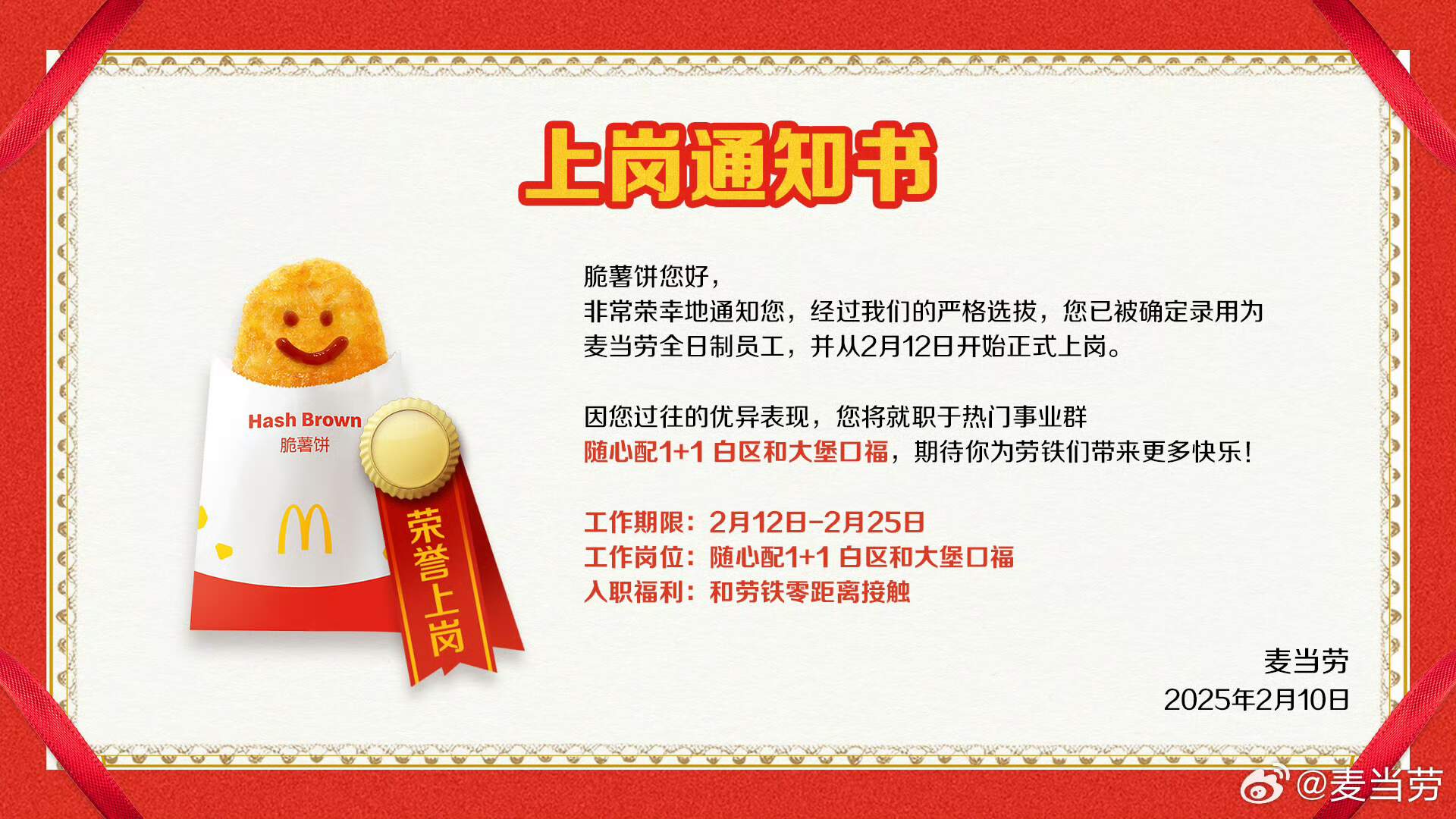 在金拱门首届粉丝大会上,听劝的麦当劳通过了「脆薯饼全天供应」的提案,就此开启了薯饼悲催的职场历程。麦当劳不仅官方发布薯饼《上岗通知书》,还上线了一系列meme搞笑短视频宣告这一喜讯,引发麦门信徒欢呼雀跃,点开麦当劳点餐小程序的订单界面,脆薯饼表情包的画风逐渐心酸起来,只有它受伤的世界达成了。虽然此项企划仅维持了半个月,稍显诚意不足,但麦当劳还是凭借「不错过任何一个职场梗」的超强网感,在短时间内收割大波关注,完成了一场与粉丝双向奔赴的集体狂欢。