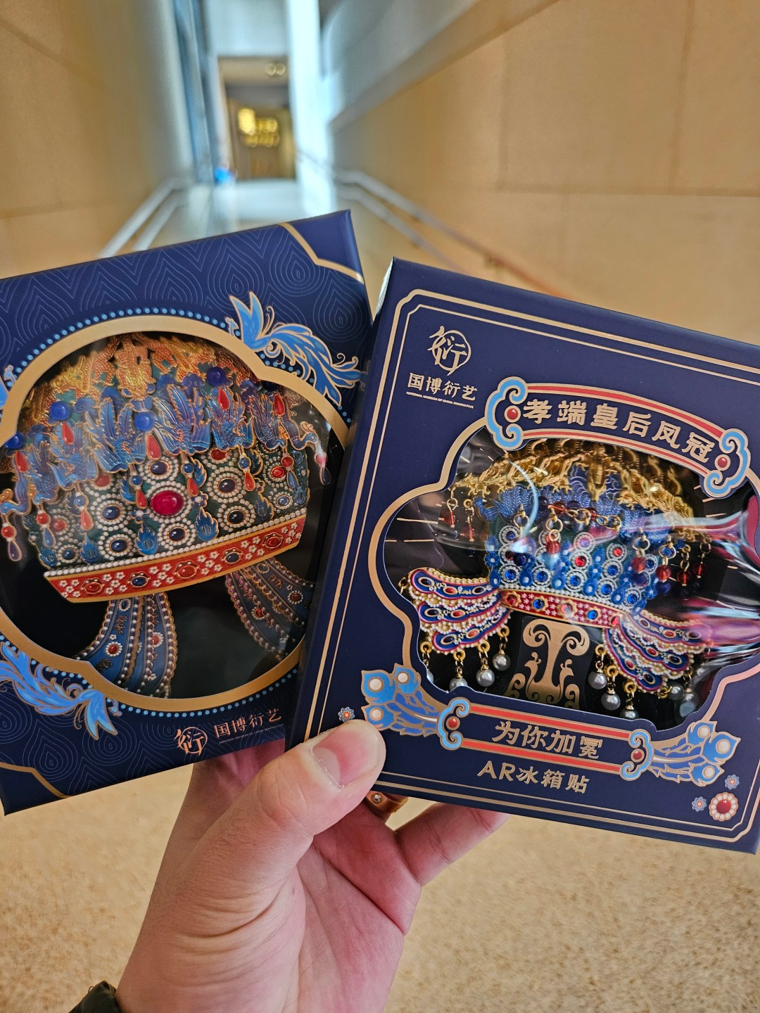 还有中国国家博物馆以明孝端皇后九龙九凤冠为原型打造的凤冠冰箱贴,造型极致精美、近乎等比例缩小、一比一复刻设计制作,极致精美,最新升级的凤冠冰箱贴还创新了AR互动,扫码即可开启AR体验,“戴上”凤冠,体验皇后般的尊贵气质。