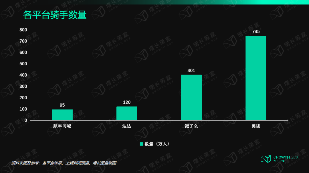 目前京东外卖业务配送由达达平台骑手负责。从各平台对比中可以看出,美团及饿了么的骑手数量仍占据主要优势,达达骑手数仅排名第三,虽相较顺丰同城高出不少,但运力供给秒送有余、支持外卖却略显不足。