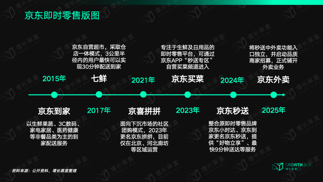 早在2015年,京东就推出了“京东到家”服务;在2016年引入达达后,京东到家的运力优势进一步加强;2024年,京东将“京东小时达”和“京东到家”整合升级为“京东秒送”,并逐步上线外卖服务。2025年,东外卖正式启动“品质堂食餐饮商家”招募,并将外卖入口设置于APP首页,大力推广外卖业务。