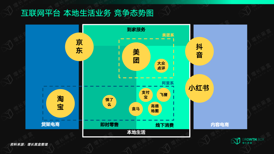 通过分析不同互联网平台与本地生活领域的交集,我们总结出了以下的“竞争态势图”,共同进入本地生活场域后,互联网平台也逐步找到了适合自己的生存空间。
