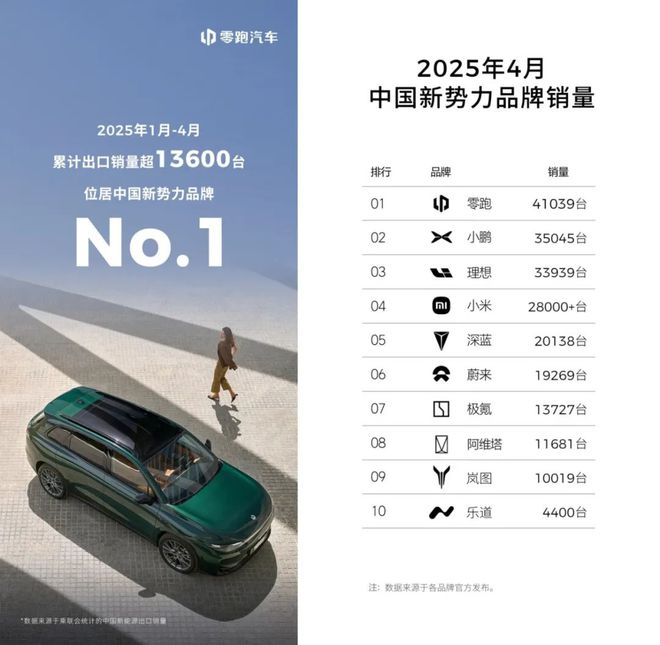 2)1-4月,零跑出口13632台,亦是造车新势力品牌中出口量最大的车企。