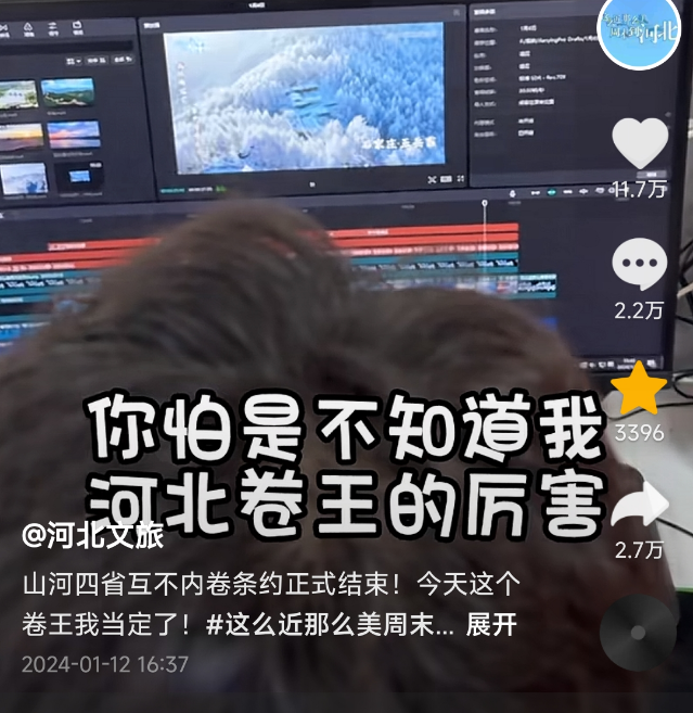 他们高调喊出“山河四省互不内卷条约正式结束,今天这个卷王我当定了!”的宣言,随后便开启了“疯狂输出模式”——一天之内竟然更新了75条短视频,并且都带上了#河北卷王#的话题标签。