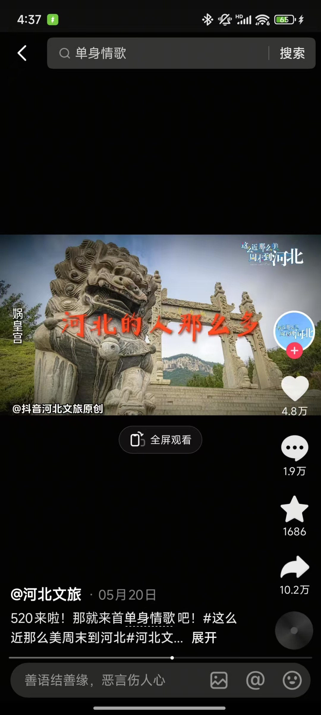 他们对热点的捕捉从未停止,前段时间在《歌手》热播期间,河北文旅官方抖音号又巧妙地改编了参赛歌手林志炫的代表作《单身情歌》的歌词,用以宣传河北旅游,其反应速度和创意能力可见一斑。