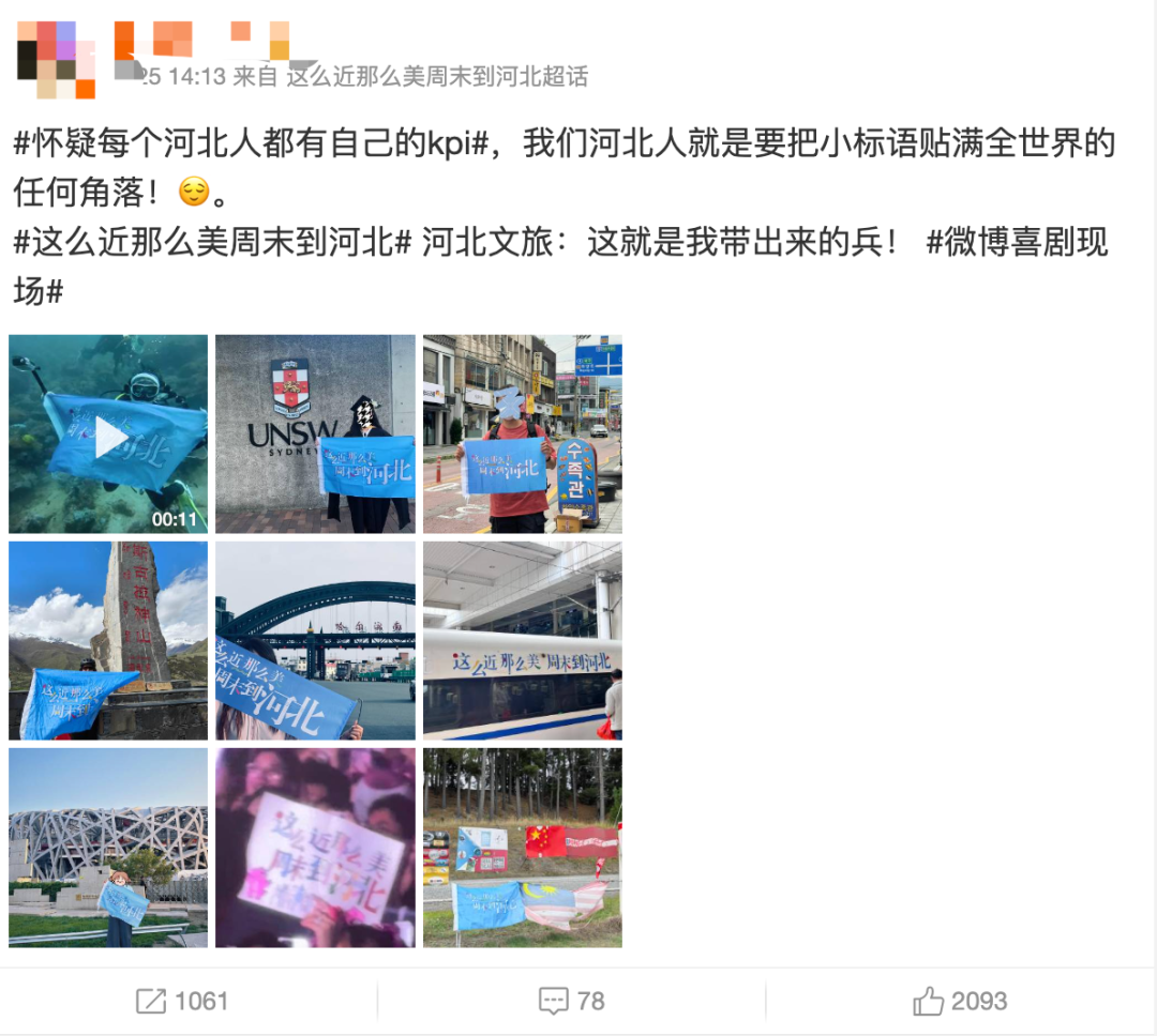 这股UGC的热潮中,涌现出不少自发行为。有河北的网友自发制作了印有“这么近那么美,周末到河北”口号的小旗帜,带着它到全球各地旅游打卡并拍照上传,形成了一道独特的风景线。