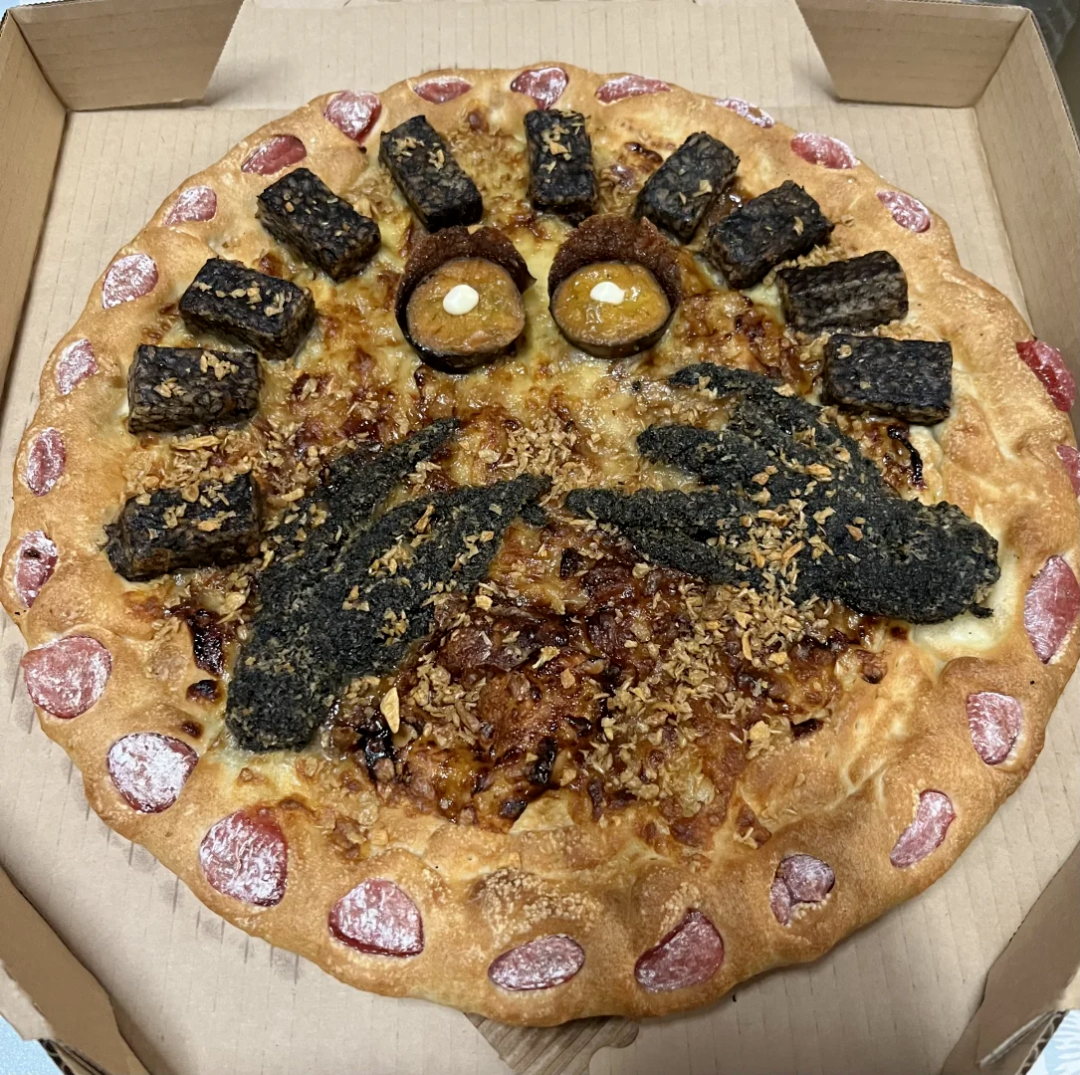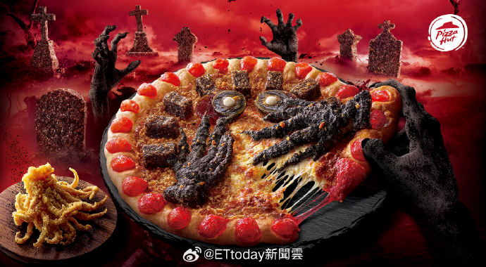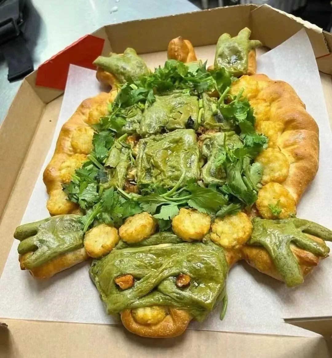 还有更早的“绿毛龟披萨”,红眼绿壳配咸甜馅料,实物效果也是相当惊悚。