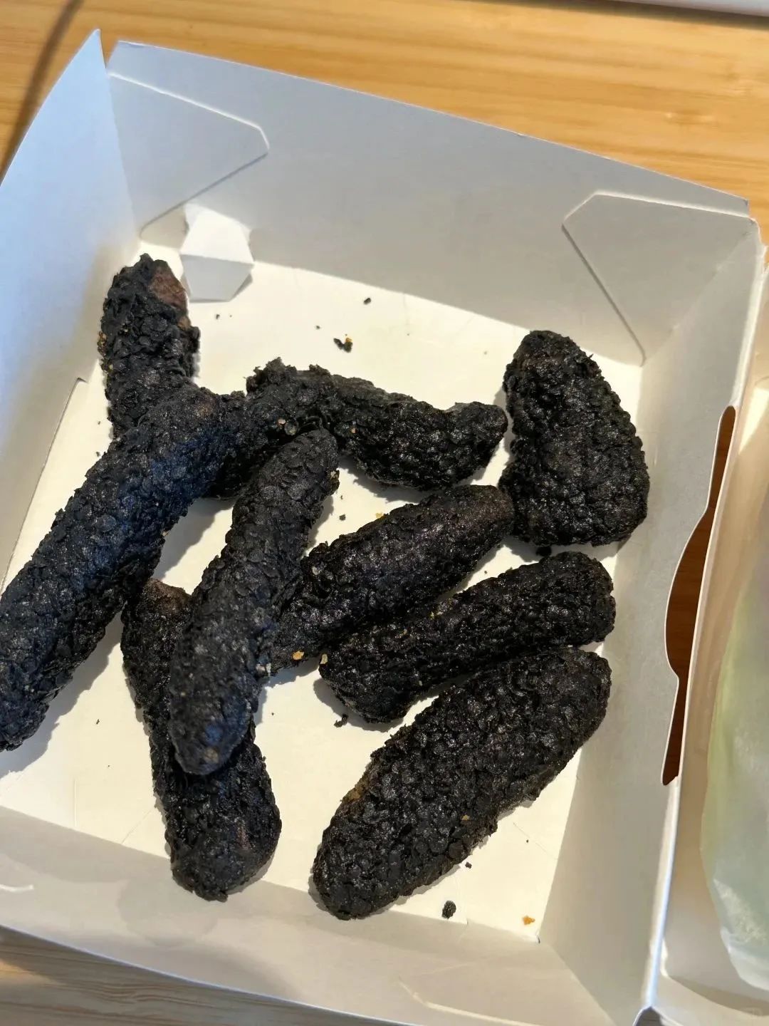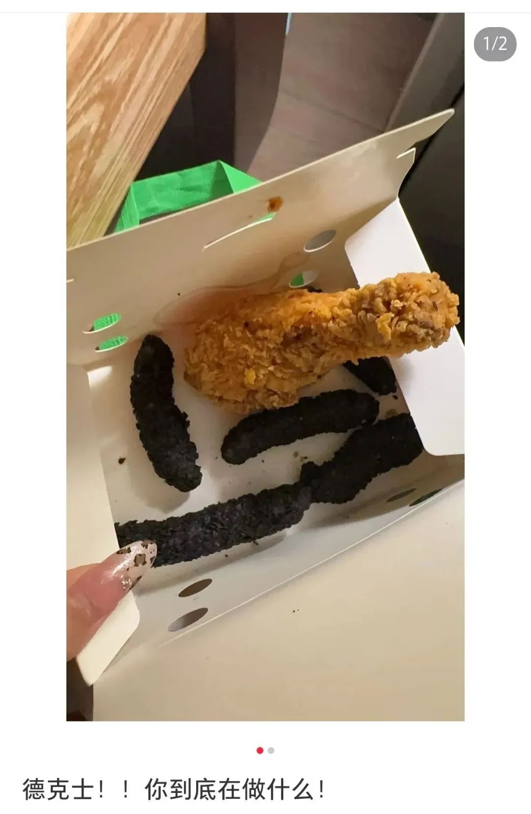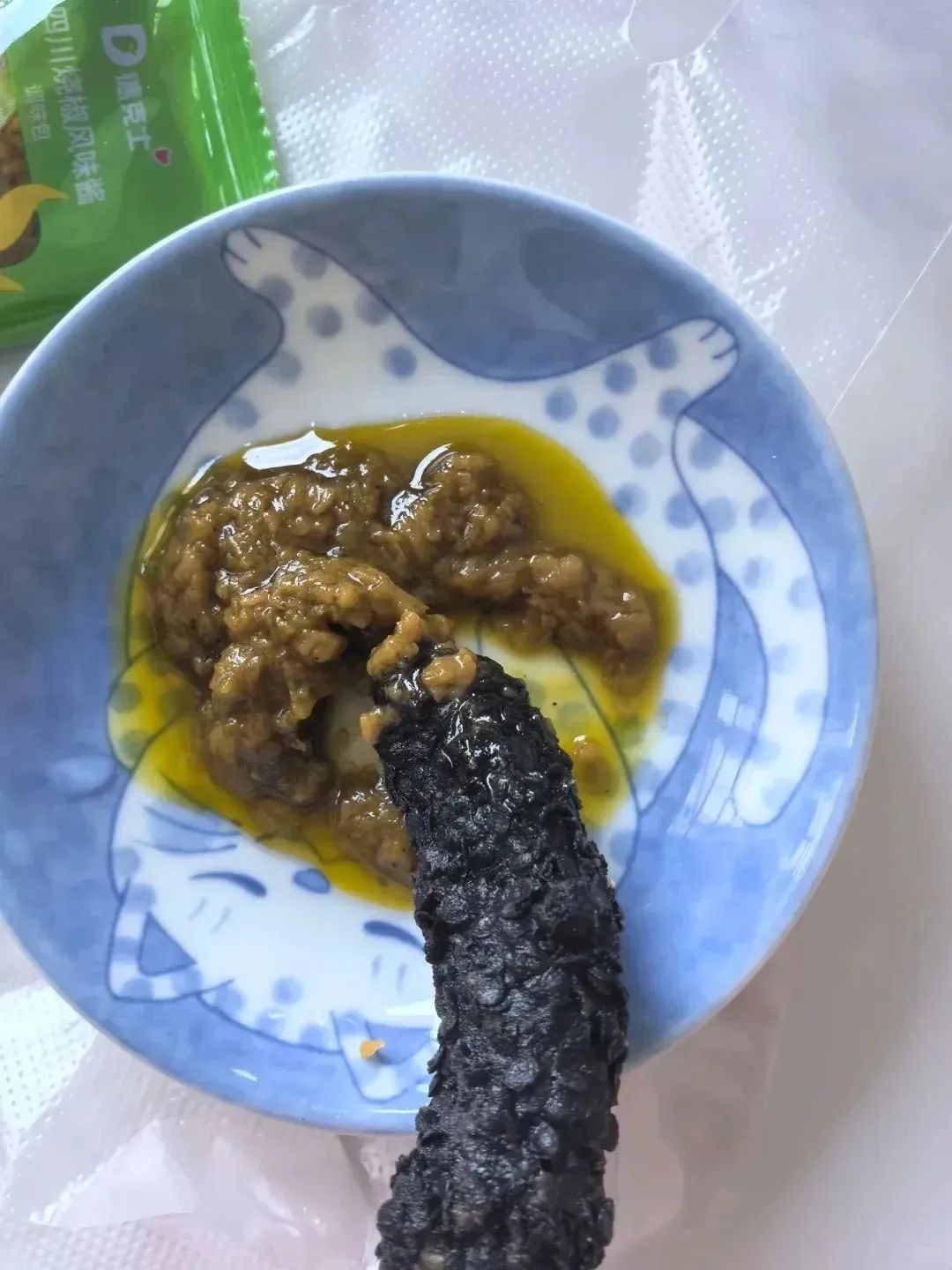 黑不溜秋的造型配上诡异的弯曲弧度,再蘸上酱料,被网友辣评:“加长便饭”。