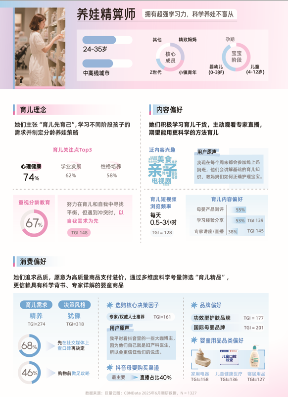 「养娃精算师」是育儿界的“六边形战士”,满足孩子需求与自我成长双轨并进。育儿理念上,她们积极了解孩子的需求并制定分龄养娃策略;内容偏好上,她们通过专家直播学习科学育儿方法;消费偏好方面,她们追求品质,更信赖具有科学背书的婴童商品。