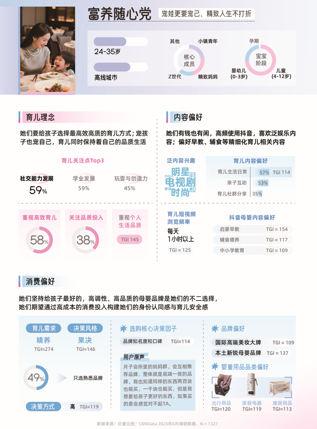 「富养随心党」养娃的同时也悦己,消费决策果断,给娃和自己同步顶配人生。育儿理念上,她们宠孩子也宠自己,育儿同时保持品质生活;内容偏好上,她们喜欢泛娱乐内容;消费偏好上,她们看中身份认同感与育儿安全感,倾向选择高调性、高品质的母婴品牌。