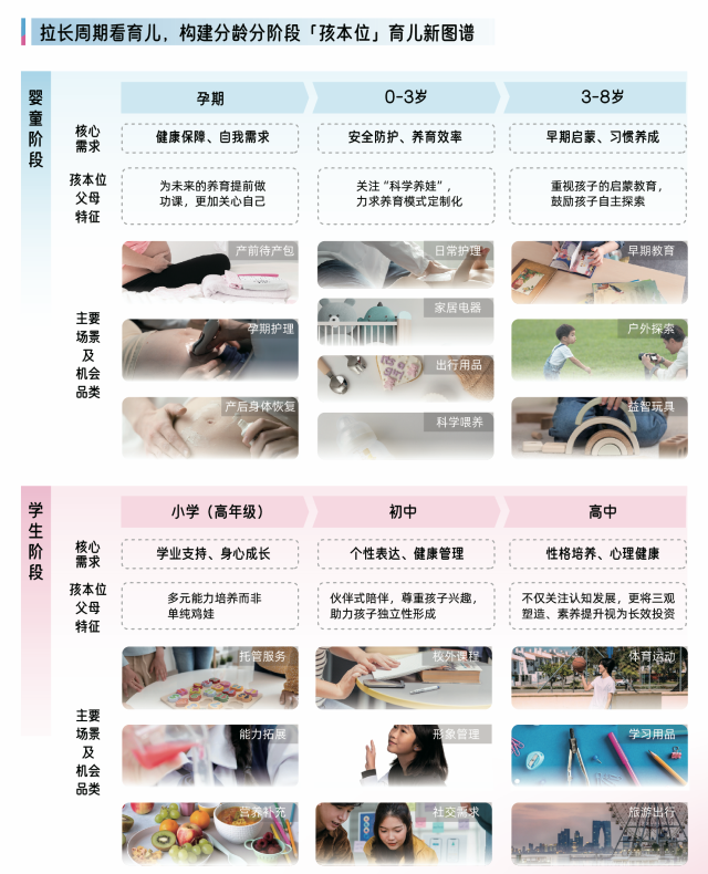 当下的母婴赛道早已跳出“孕期+婴幼儿”的传统框架,一路伴随孩子从呱呱坠地到青春叛逆,同时把家长的身心成长也纳入服务版图。若从中学阶段画一条分水岭,婴童养育需求和青少年培育的需求呈现较大的差异性,可分别探讨。
