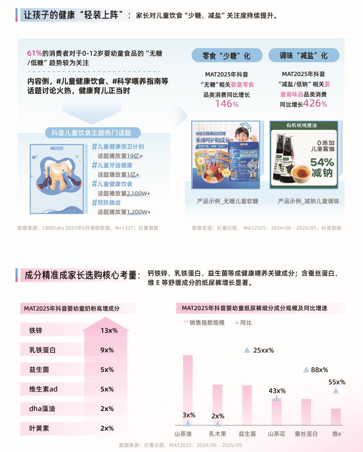 既要精准补充,更需科学精简,成分透明化与健康减负正重塑育儿消费决策。抖音电商无糖零食同比增长146%,减盐调味品消费暴涨426%、#儿童健康饮食、#科学喂养指南 等话题高热也印证了儿童食物选择的“加减辩证法”。