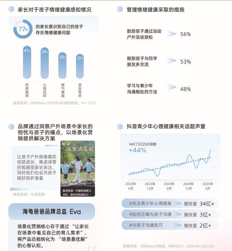 对品牌而言,可以通过“场景化营销”,洞察并解决户外活动中的痛点,让家长直观感知价值。海龟爸爸品牌总监Eva表示,场景化营销核心在于通过 “让家长在场景中看见自己的育儿需求”,将产品功能转化为 “场景最优解” 的心智认知。