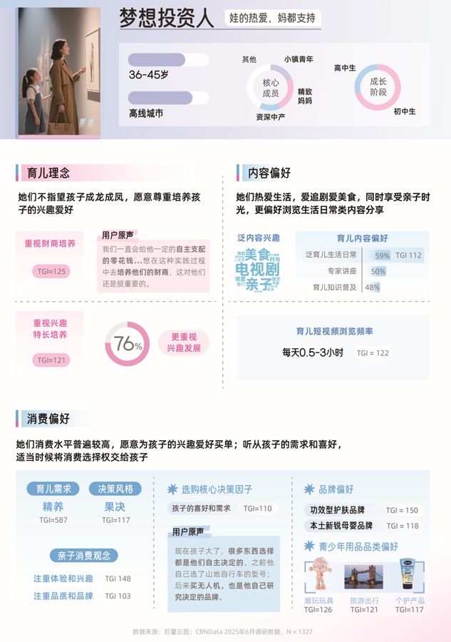 「梦想投资人」践行“娃的热爱,妈都支持”,带娃讲究“放养式精致”。她们不逼娃竞争,却能捕捉孩子兴趣的闪光瞬间;自己追剧嗦粉,也带娃吃喝玩乐。消费力强且开明,既愿为孩子的爱好买单,也常在关键时刻将选择权交给孩子。