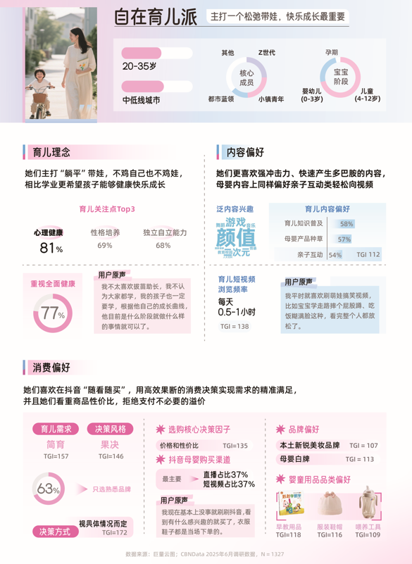 「自在育儿派」践行快乐育儿主义,以理性决策实现轻量化育儿。她们在育儿理念上关注孩子心理健康,内容偏好上喜欢多巴胺亲子视频,消费中倾向选择高性价比好物,拒绝为品牌溢价买单。