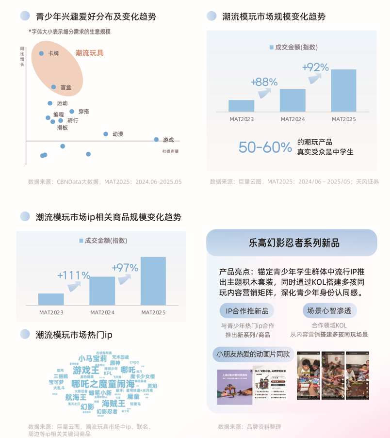 在自我实现层面,兴趣圈层里,青少年用多元爱好创意“整活”,将潮流 IP 玩成社交货币,匹配其兴趣的IP联名及场景化营销有助于品牌开拓增量。乐高幻影忍者系列新品就锚定青少年学生群体中流行IP推出主题积木套装,同时通过KOL搭建多孩同玩内容营销矩阵,深化青少年身份认同。