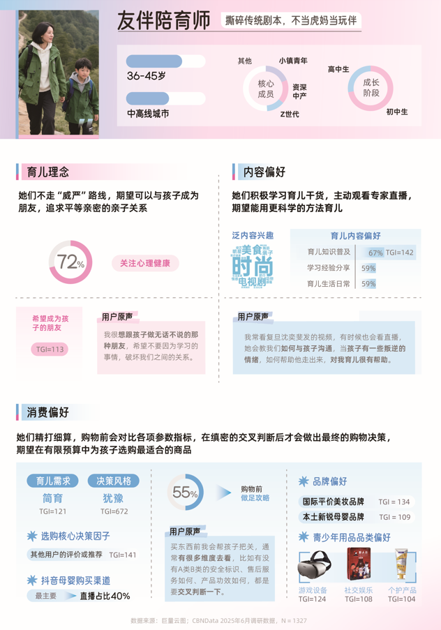 理性至上的「友伴陪育师」则化身孩子玩伴,追求“神仙友谊”般的平等亲子关系。她们育儿时尚双修,既刷穿搭也研习沟通话术。消费中坚持参数对比、缜密判断,真正做到“爱要双向奔赴,钱要花得门清”。