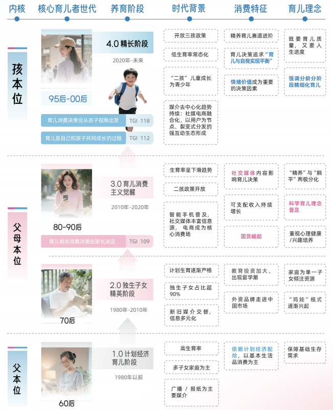 回溯过去,育儿观历经三次跃迁:1.0计划经济时代的配给制、2.0独生子女时代的资源集中、3.0消费主义觉醒带来的理念分化。如今,我们已进入育儿决策“孩本位”的4.0“精长阶段”——不仅追求精细化养育,更强调父母与孩子的双向成长,实现分龄科学育儿与情绪价值双轨并进。