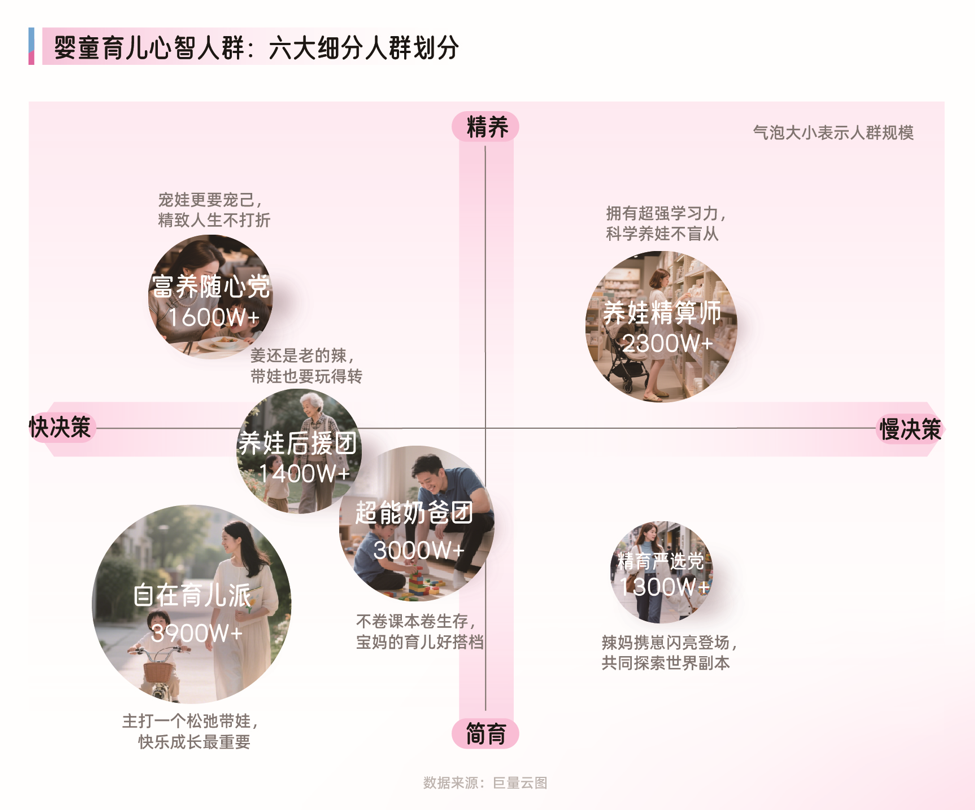 此外,还有践行“亲子共生”的潮流辣妈「精育严选党」、专注技能培养共担育儿责任的「超能奶爸团」,以及善用“代际融合”的老一代育儿群体「养娃后援团」,他们分别代表了婴童养育中的时尚共育、能力协作与经验传承群体面向,折射出育儿主体多元化、育儿主体双向化的趋势,展现了家庭角色重构与代际协作型育儿新风尚。