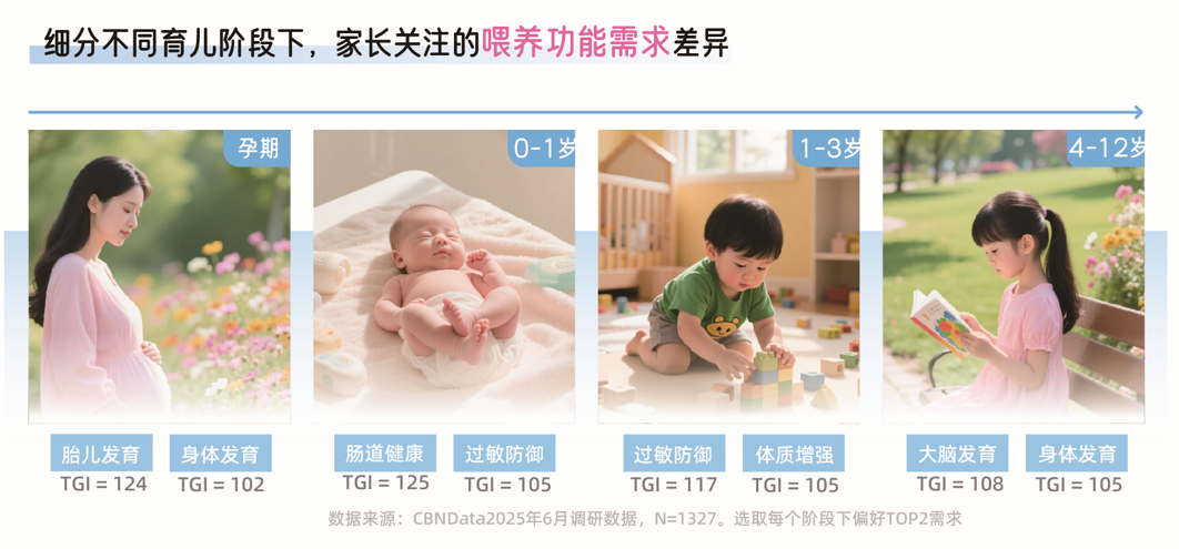 与此同时,育儿消费也进入了全周期分龄适配时代。婴童期以科学喂养与自主探索为核心,学龄期转向个性化发展与学业支持。当代父母在功能场景差异化管理基础上,更将育儿理念与消费选择相结合,通过选择认可品牌价值观的品牌表达身份认同。