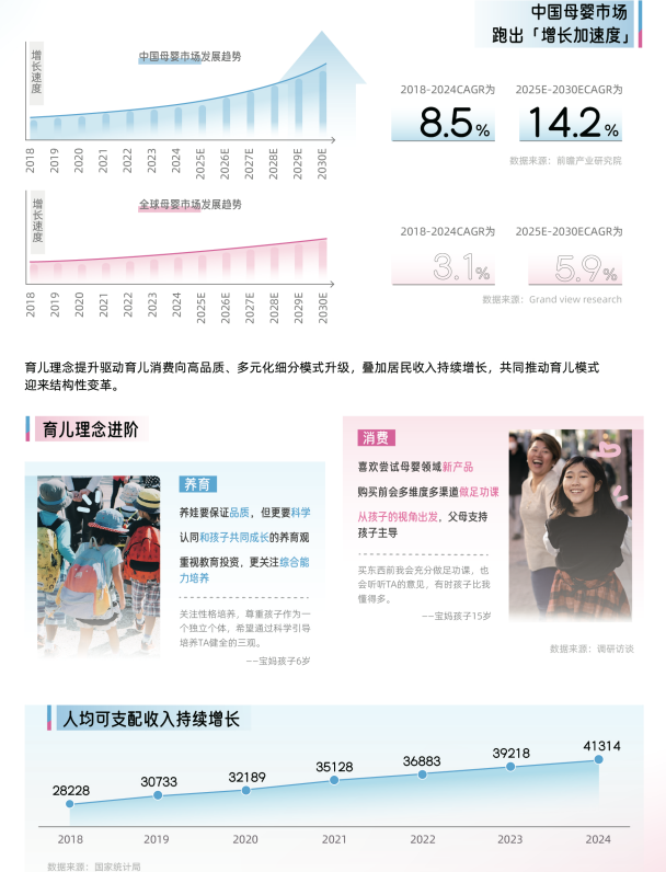 在育儿理念的升级与人均可支配收入持续增长的“双轮驱动”下,中国母婴市场增速全球领跑。一方面,新一代父母崇尚科学养育与亲子共成长,追求教育综合化;另一方面,他们也在消费中逐步把决策权让渡给孩子——“孩本位”育儿时代正式来临。
