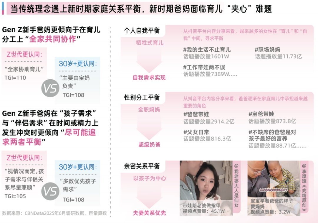 如何面时间分配、理念冲突与关系平衡等育儿挑战?Z世代提出了「三维平衡」方法论——坚守自我实现、推动性别分工平等、维护伴侣亲密关系。超75%家庭倾向育儿协作制,孩子与伴侣需求冲突时优先选择动态平衡策略......育儿不再以牺牲个体为代价,而是通过多元身份协同运营,构建弹性稳定的家庭生态系统。
