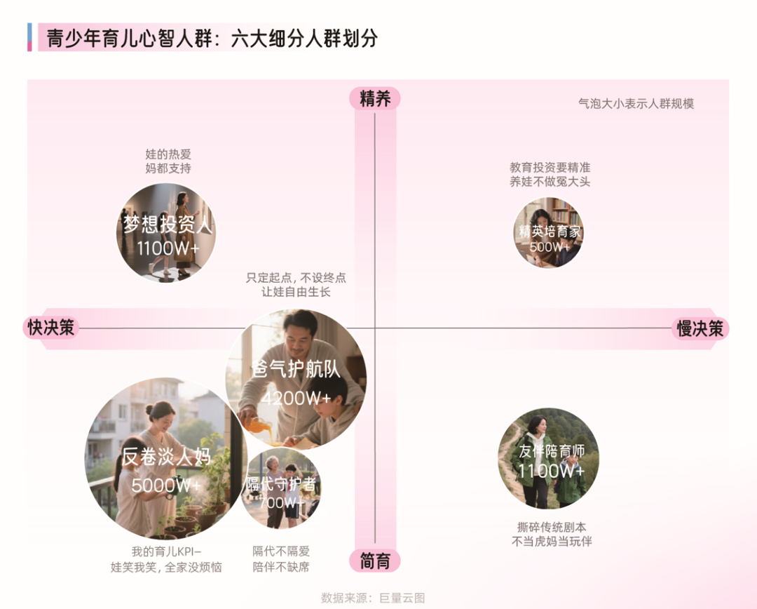 在宏观市场趋势和整体人群需求之外,消费者分层还能进一步细化出哪些更精准的人群画像?根据“育儿需求”和“决策风格”可将家长划分为六大心智人群:反卷淡人妈、友伴陪育师、梦想投资人、精英培育家、爸气护航队和隔代守护者。