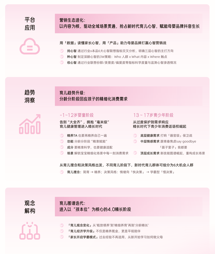 在这一趋势和背景下,抖音平台更是展现出不可替代的价值。依靠「多元内容」与「人群共振」生态,巨量引擎以数据洞察精准定位需求、“找心智-种心智-收心智”的「科学营销链路」和贯通“种草-决策-转化”的「全域场景能力」,为品牌构建育儿心智提供了丰沃土壤。