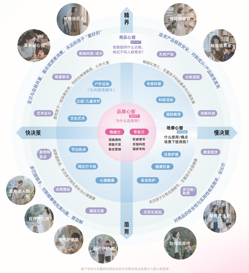 以“决策速度 × 育儿观念”为坐标,12大母婴人群被精准划入四大象限,形成一套多维立体的「养娃坐标系」。以品牌心智为核心、场景与商品心智为两翼,先借 4.0「孩本位」趋势锚定品牌核心价值,针对不同人群差异化匹配场景和商品心智。痛点即落点,价值层层渗透,为品牌输出一张可落地的分层营销图谱。