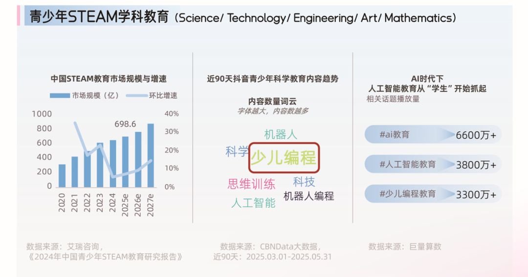 与此同时,孩子与家长也不再只卷外语、卷奥数,而是将未来技能与个人兴趣结合,德智体美全面发展。家长课外辅导观念的转变也推动了STEAM 教育兴起,少儿编程等内容在抖音受热捧;艺术和竞技体育的“反教室化”拓展让孩子们流汗也社交。