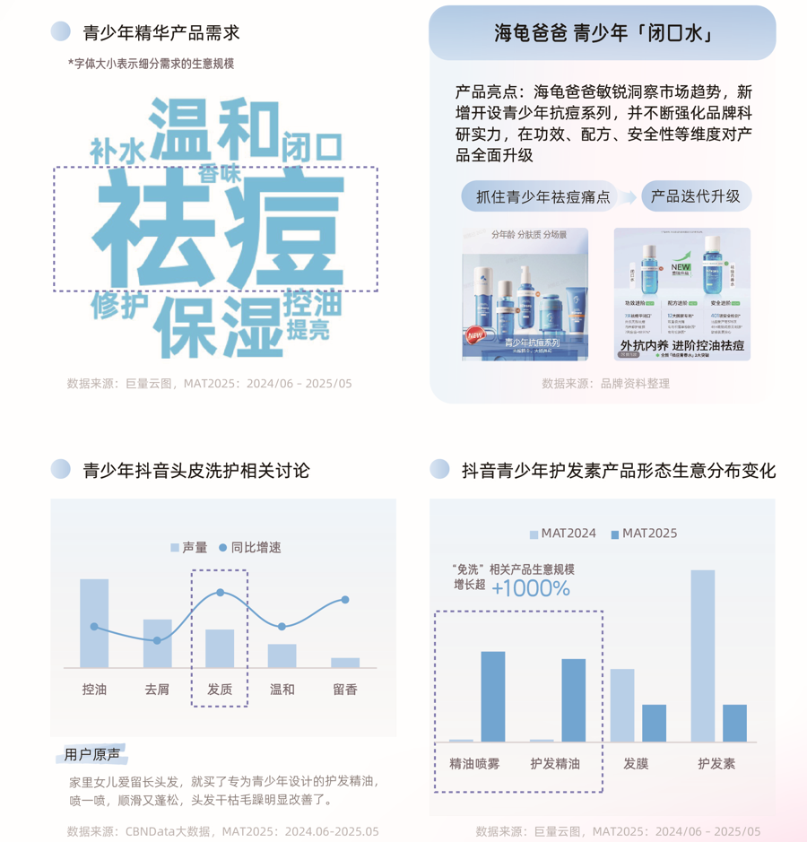 在尊重与需求层面,青少年外形管理也越来越得到重视,青少年专用洗护用品、祛痘产品,特别是护发素、护发喷雾、精油、祛痘精华、进阶祛痘产品等,具有较大增长潜力。海龟爸爸敏锐洞察市场趋势,新增开设青少年抗痘系列,推出海龟爸爸青少年「闭口水」,通过不断强化品牌科研实力,在功效、配方、安全性等维度对产品全面升级。