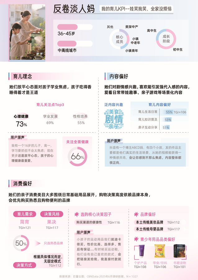 「反卷淡人妈」奉行“娃笑我笑,全家没烦恼”,堪称家长界的松弛感代言人。她们心态平和,视孩子吃好睡好为根本,拒绝学业焦虑和“高端育儿”鼓吹。她们在抖音上关注强代入感的家庭轻喜剧和带娃趣事。消费偏好实惠的日常基础品,且高度依赖熟悉、便利的品牌。