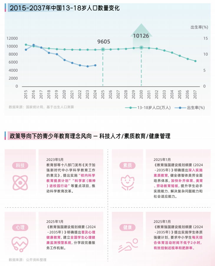 据统计数据显示,处于13-18岁的青少年人口数量在未来五年稳中有升,整体市场有增长空间。叠加素质教育政策驱动育儿观转向,科技人才培育、综合素养提升、心理及健康管理共同成为青少年教育的风向。