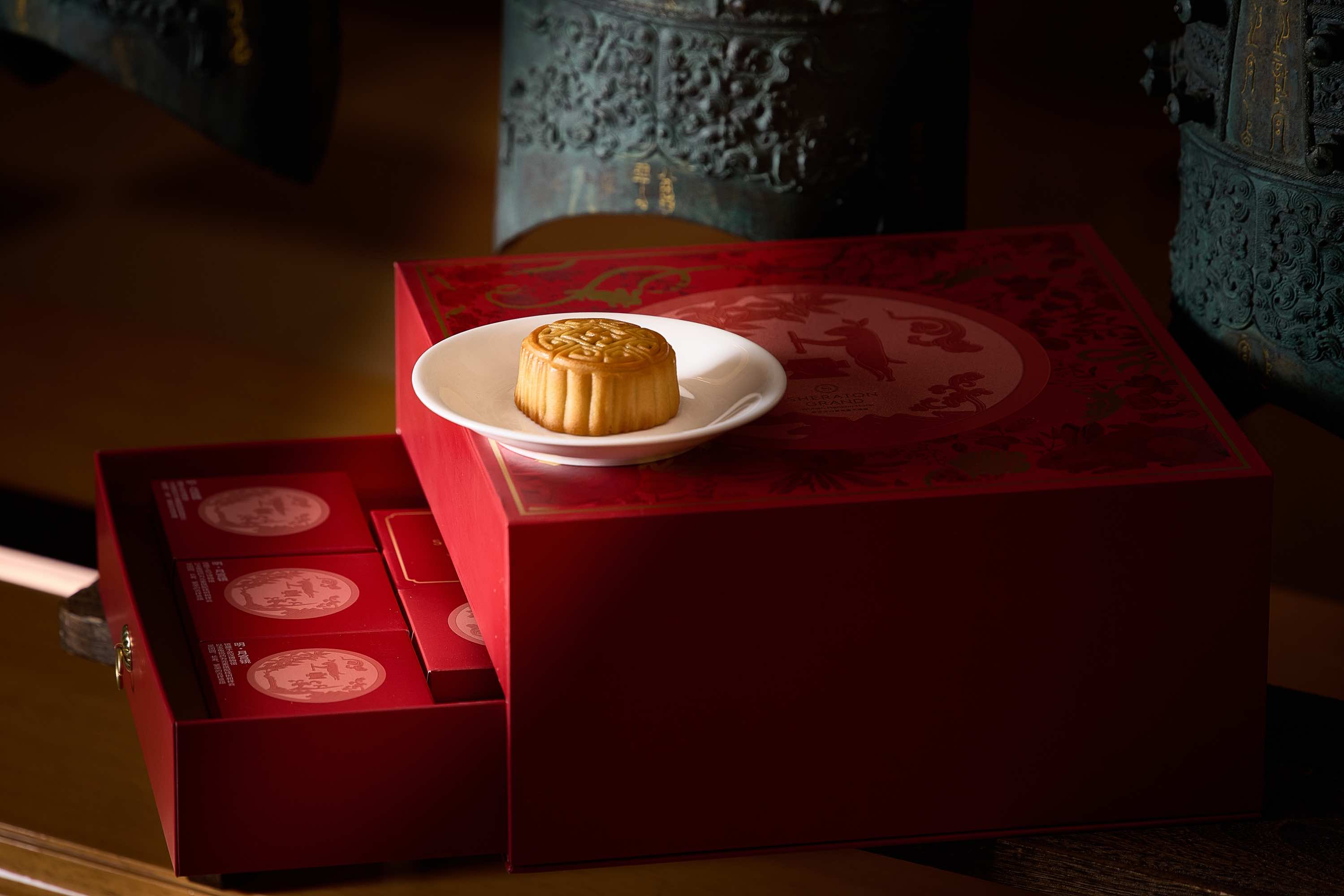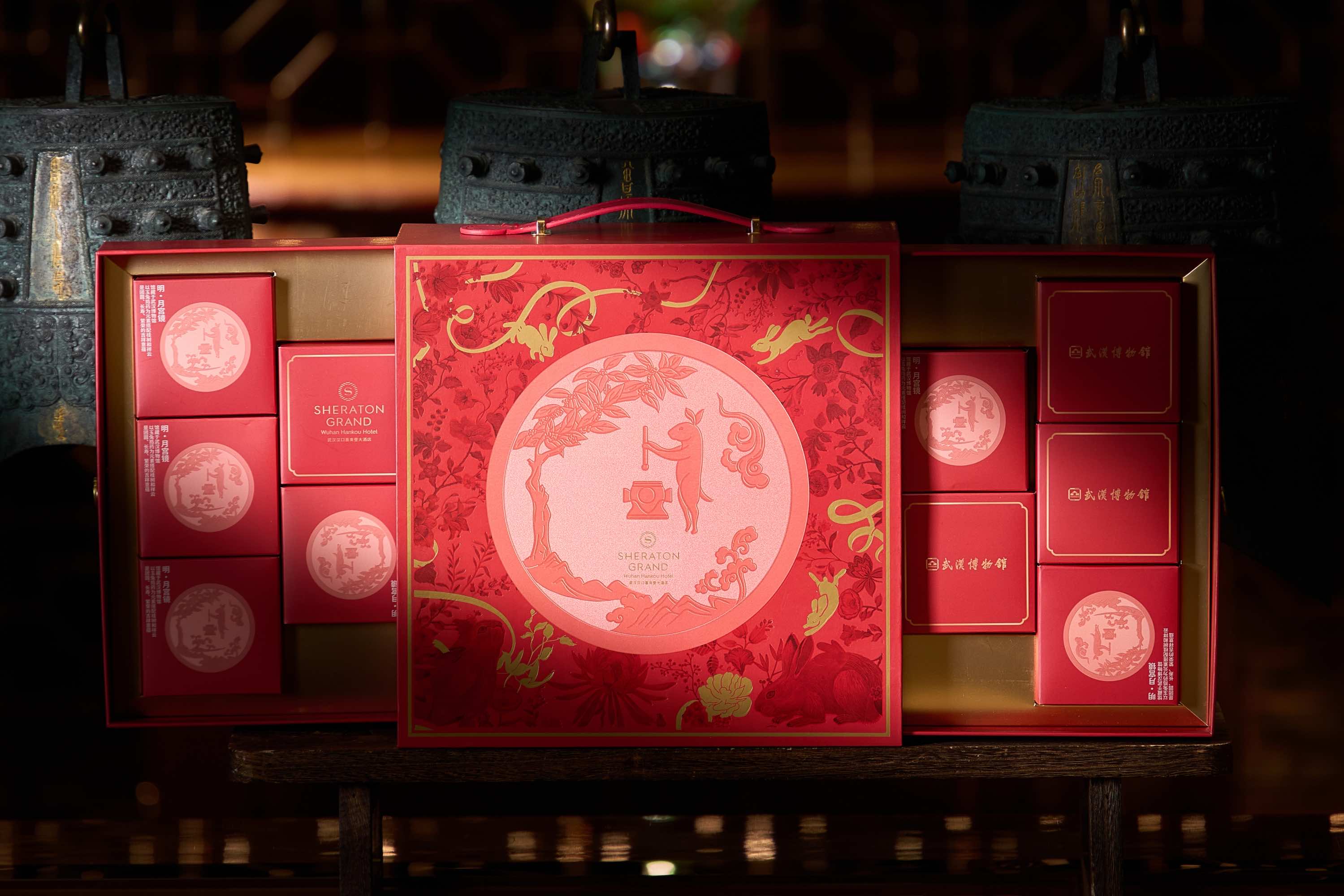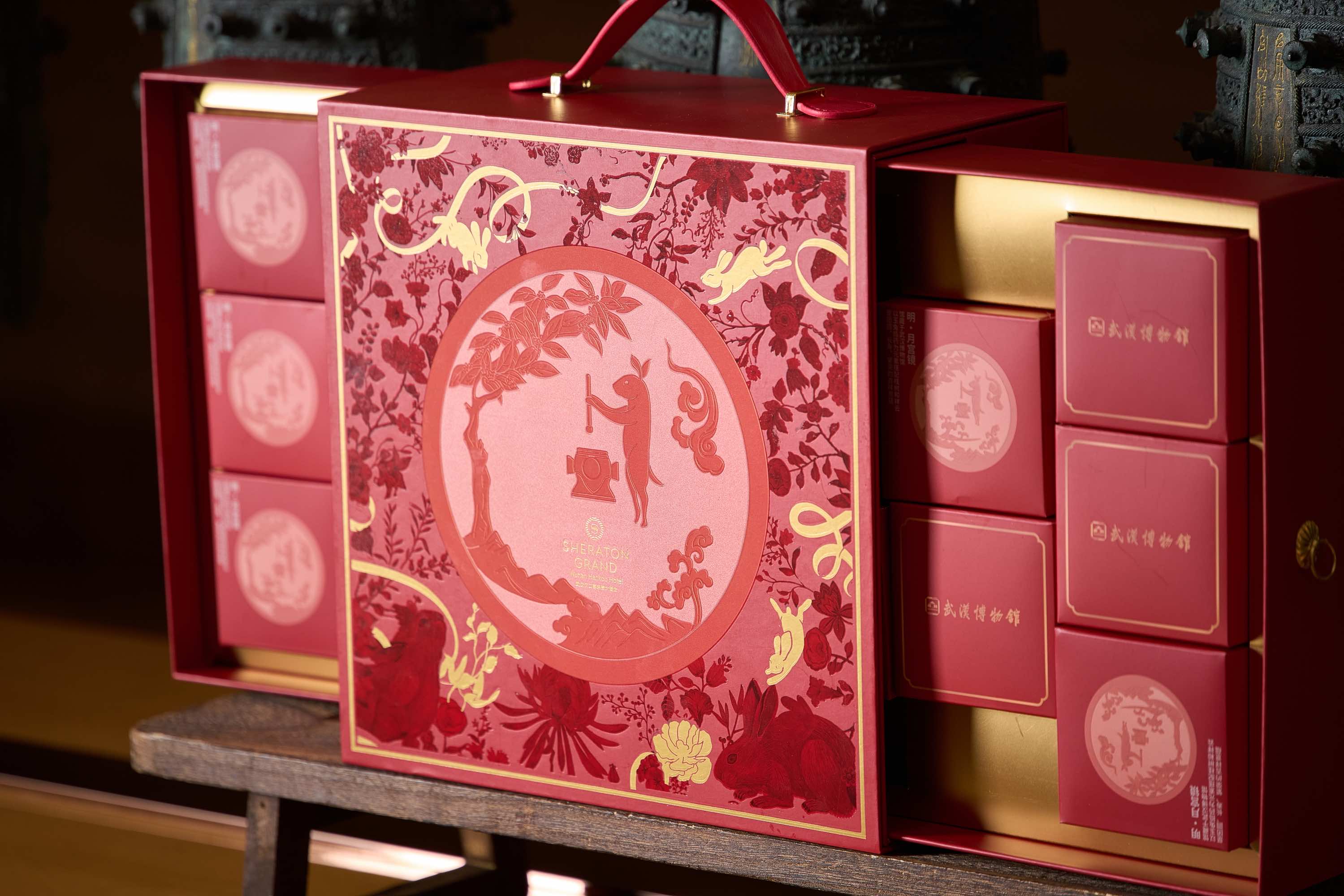 武汉汉口喜来登大酒店和武汉博物馆的联名款月饼礼盒,以醇厚中国红为底。