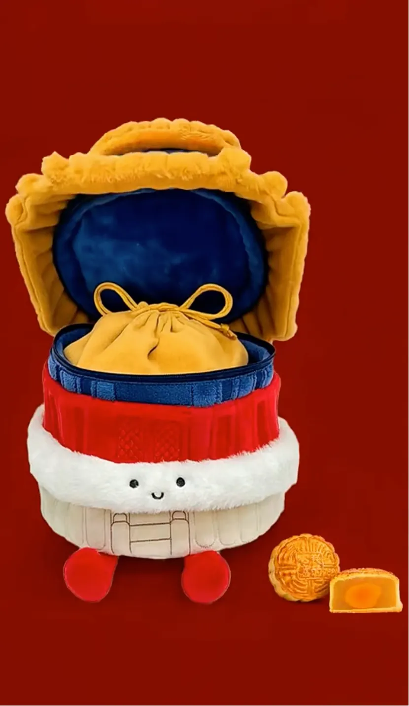 宫仔附赠肩带可秒变时尚背包。宫仔里面装着四种口味的点心,有蛋黄莲蓉饼、黑糖麻薯椰丝饼、云腿酥饼和树莓樱桃玉玲珑酥饼。