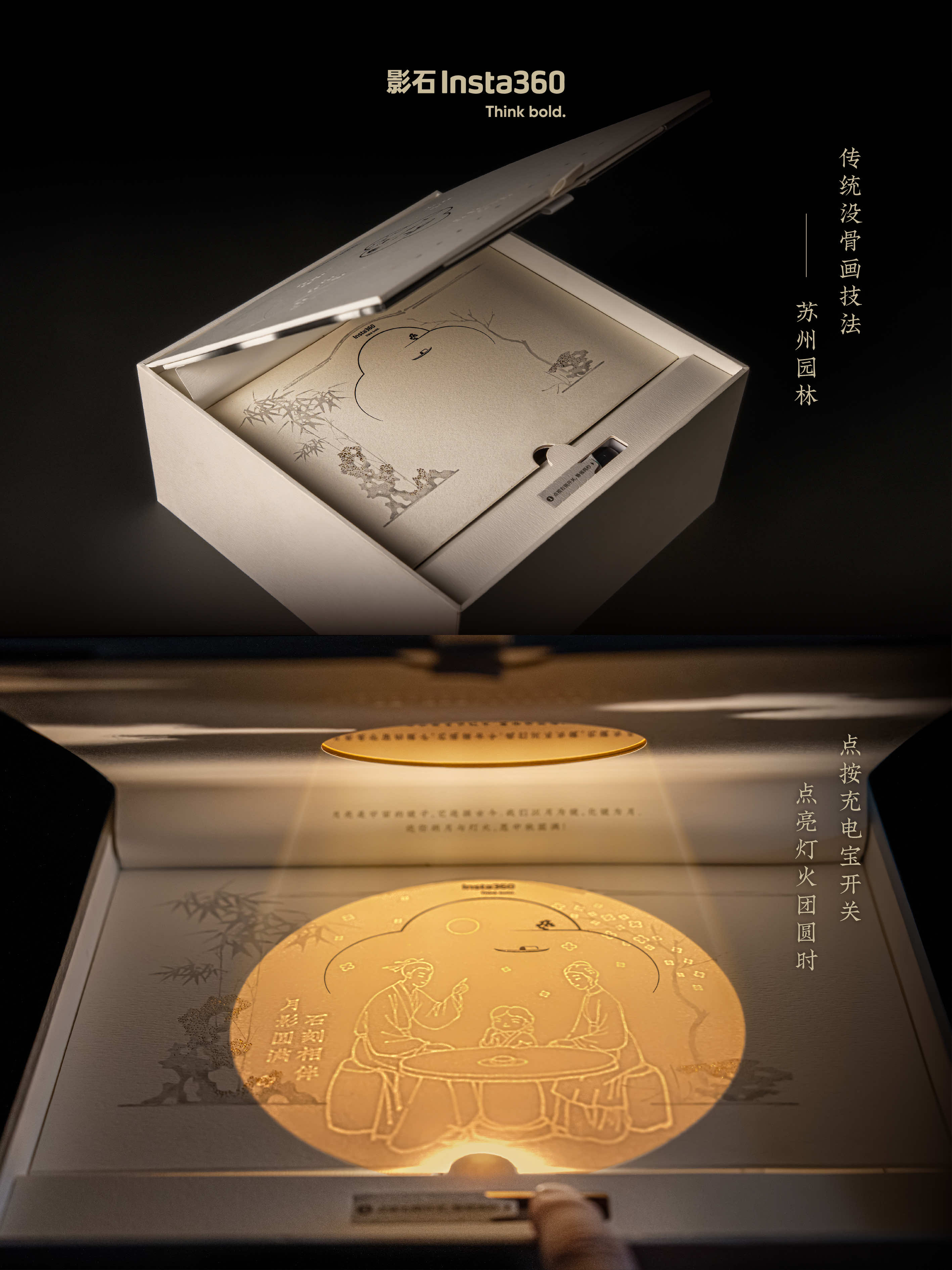 影石Insta360的礼盒以苏州园林为灵感,采用“移步换景”的设计,讲述“游子归乡”的温暖故事。
