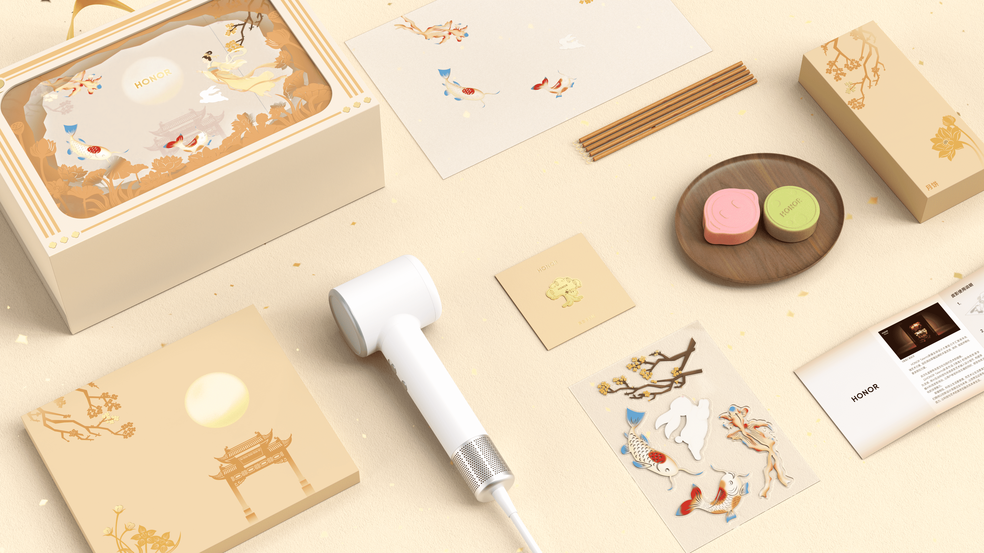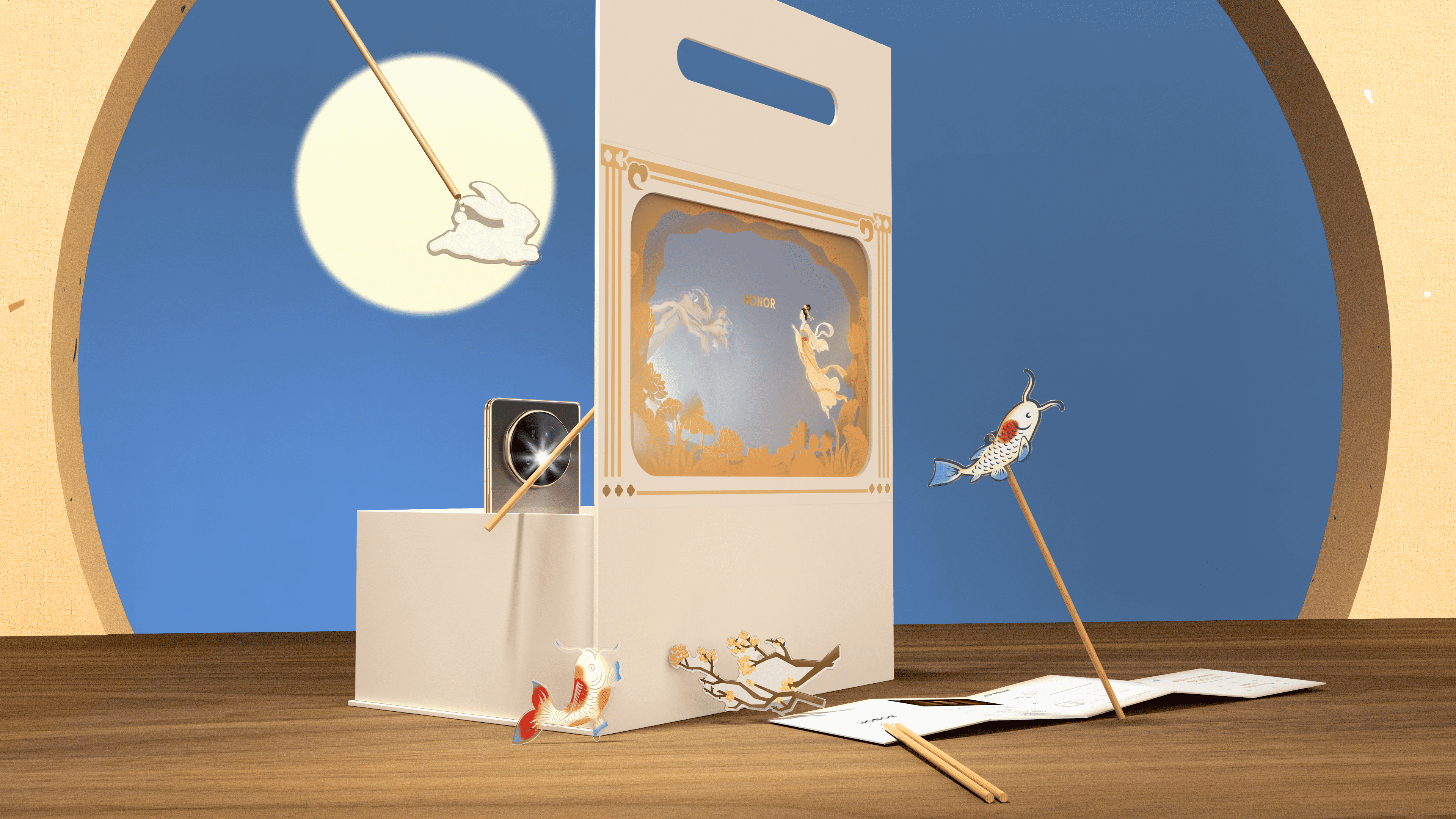 荣耀的客户版中秋礼盒聚焦非遗文化与现代艺术的融合。礼盒以HONOR Talents(荣耀全球设计大赛)作品《嬉鱼》中的剪影美学为灵感,融入光影艺术与镂空剪纸工艺。