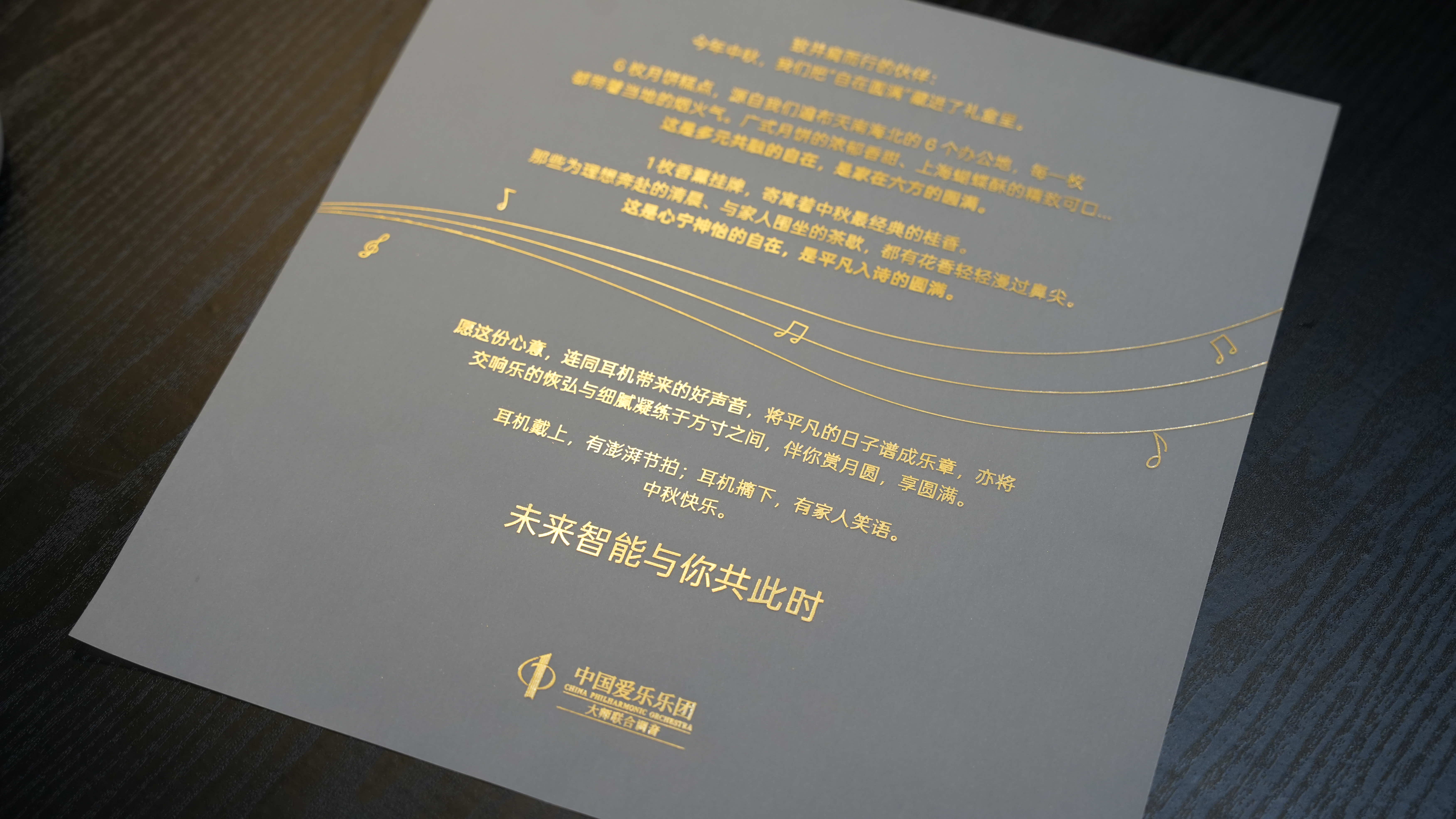 礼盒主题“自在圆满”藏有彩蛋:外盒上的“圆满”二字中巧妙融入耳机轮廓,以产品代笔画,用音乐听见圆满。