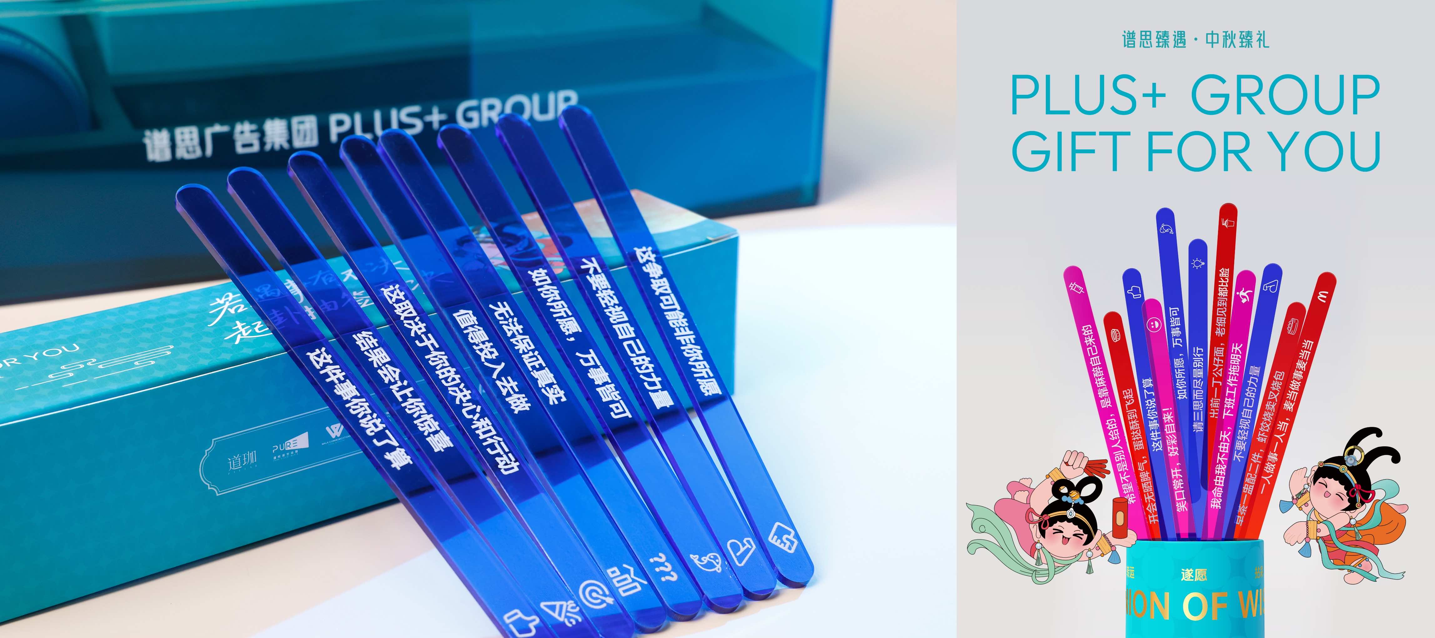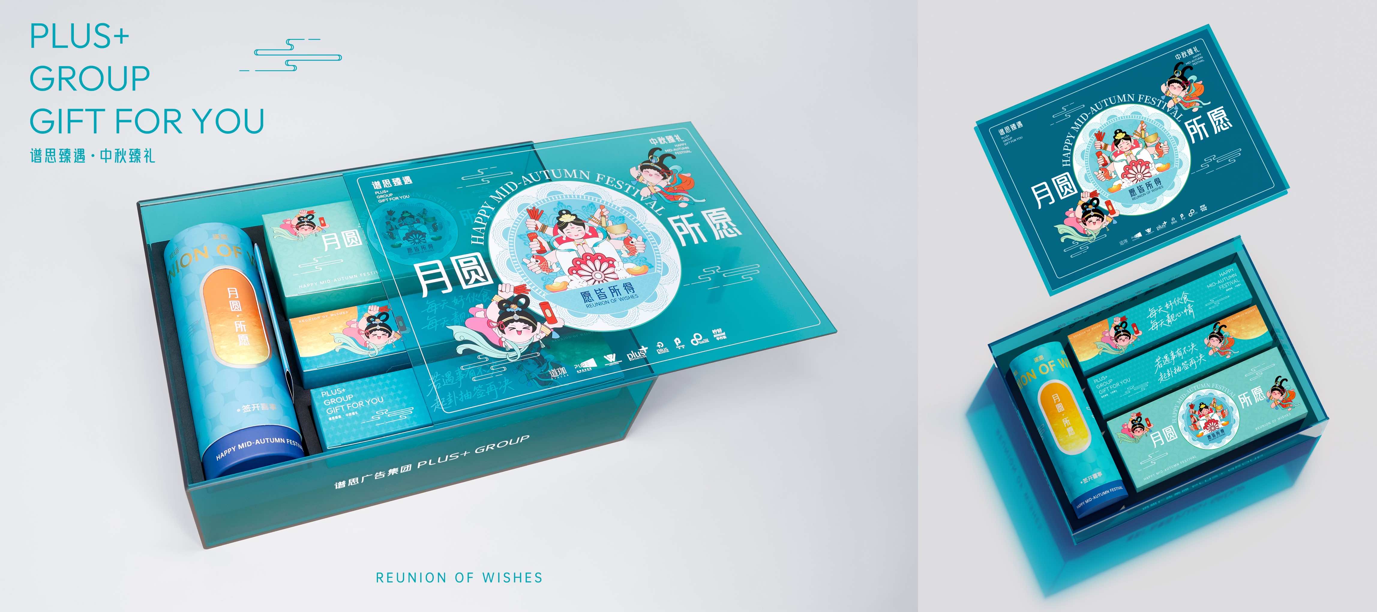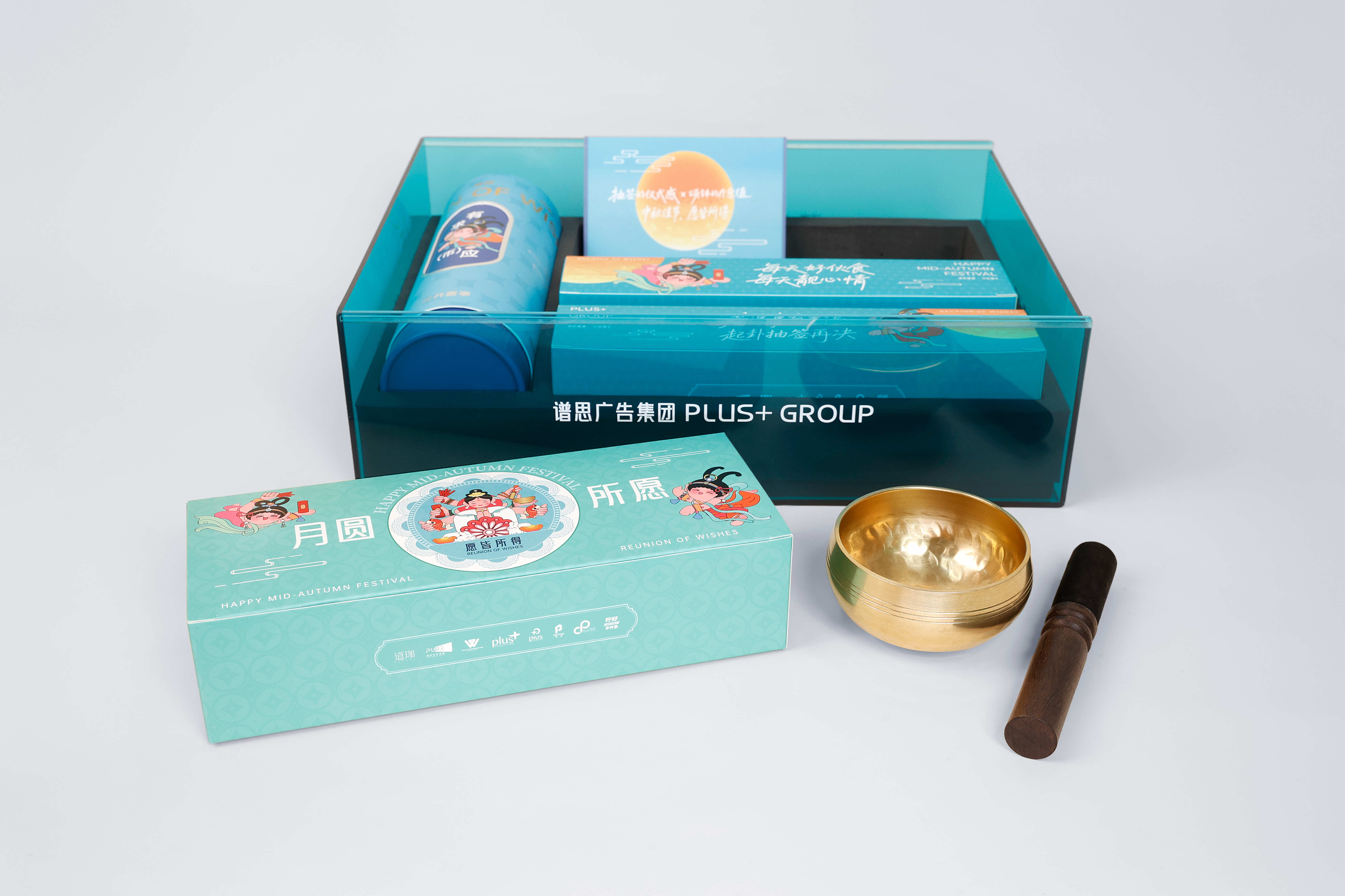 谱思广告集团的「月圆 • 所愿」礼盒承载于甸子蓝亚克力礼盒中,内含“启静”圆满颂、“启福”吉祥签、“启运”如意筒。