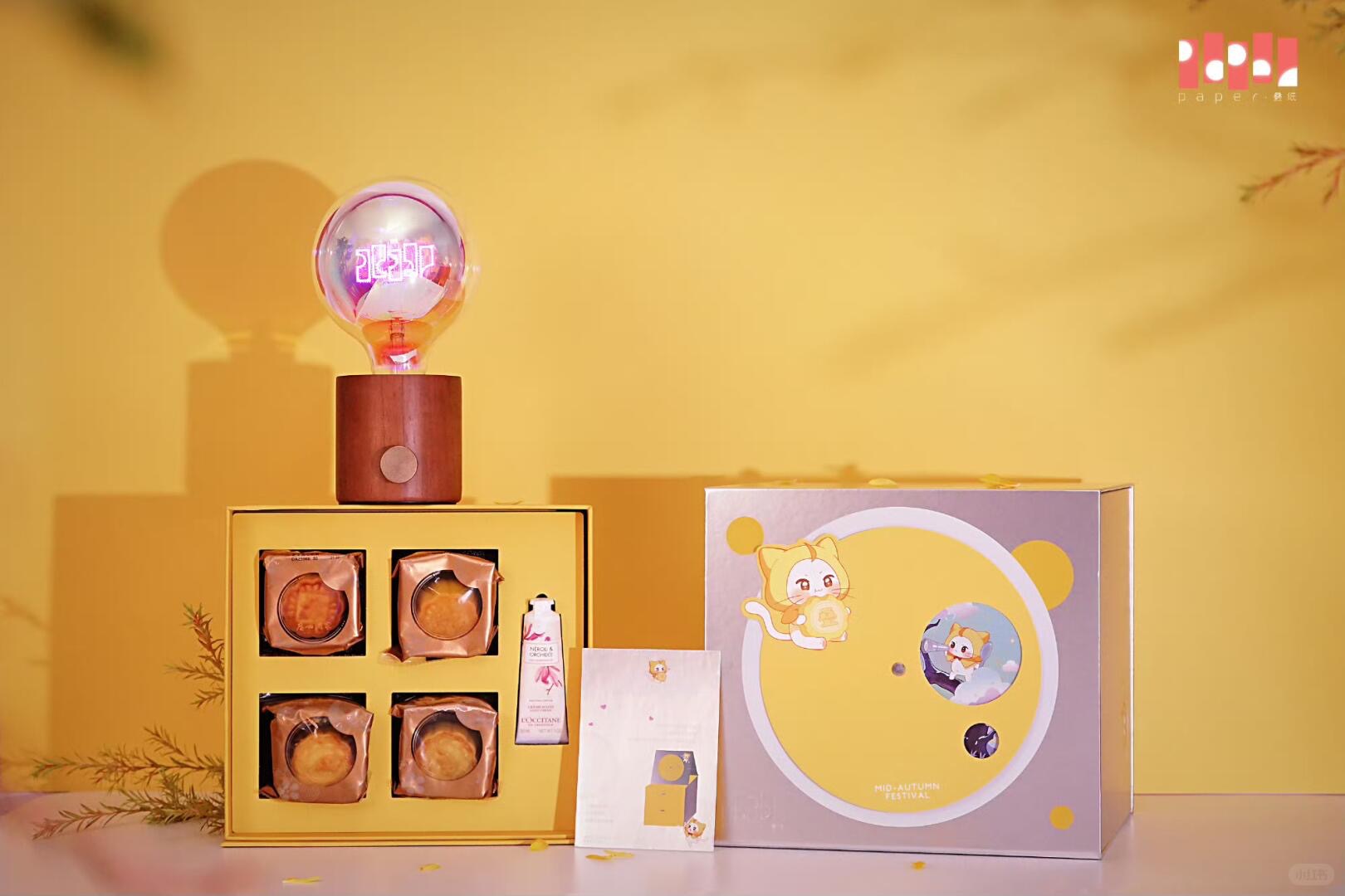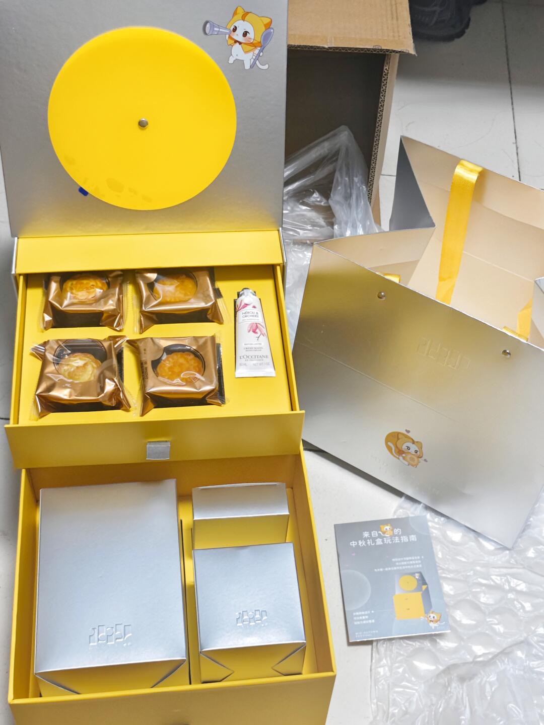 礼盒里有四枚来自广州酒家的月饼,一支欧舒丹护手霜,以及一座可充电的叠纸灯泡。